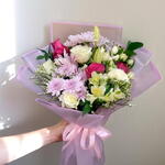 Нежный и радостный, этот очаровательный букет – восхитительное сочетание нежных пастельных тонов и ярких акцентов. Гармоничное сочетание роз, лилий, хризантем, альстромерий и цветов-наполнителей, упакованных в воздушную розовую пленку, создает букет, полный легкости и элегантности. Этот букет идеально подходит для дня рождения, подарка в знак благодарности или любого радостного праздника, он излучает счастье и нежные чувства. Чтобы букет оставался свежим, поместите его в чистую прохладную воду и подрезайте стебли по диагонали каждые 2–3 дня. Берегите букет от прямых солнечных лучей, тепла и сквозняков. Регулярно обновляйте воду и удаляйте увядающие цветы, чтобы сохранить его красоту.