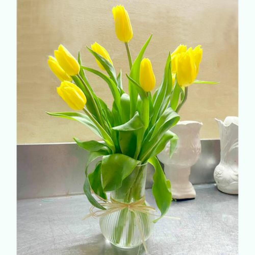 Элегантная, чистая и вневременная — наша ваза с жёлтыми тюльпанами — идеальный символ мира и красоты. Устроенные в минималистичной вазе, эти свежие тюльпаны привносят мягкое очарование в любое пространство. Идеально для продуманных подарков, тихих уголков или вашего маленького островка спокойствия.
