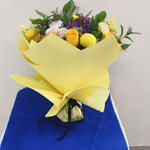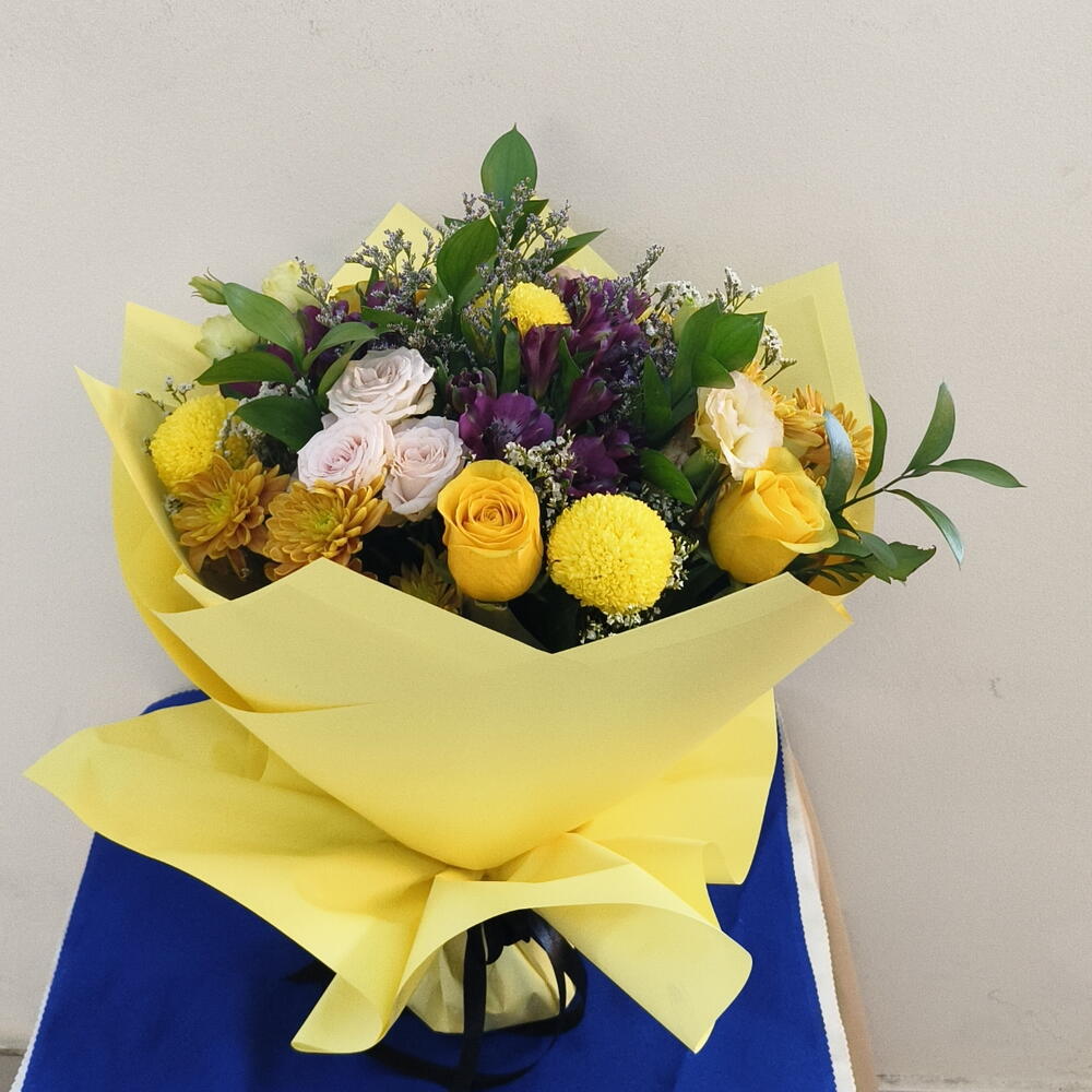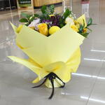 Красивый букет желтого цвета с хризантемами желтого цвета, желтыми розами, желтым пинг-понгом и нежно-розовой маленькой розой, завершающим штрихом в желтой упаковке.