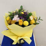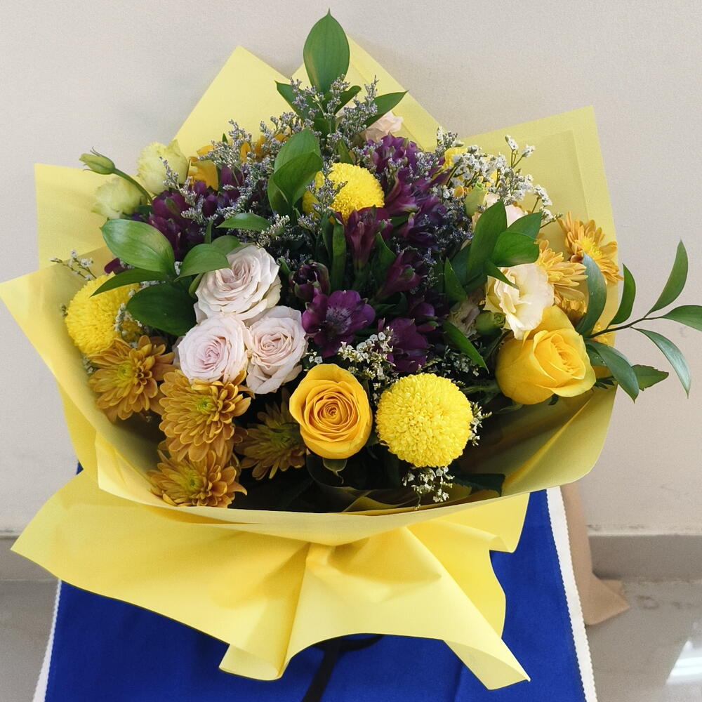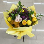 Ruscus - 4 шт. Yellow rose - 4 шт. ping pong - 3 шт. светло-розовая мини-роза - 2 шт. chysanthemums - 3 шт. альстромерия - 3 шт.