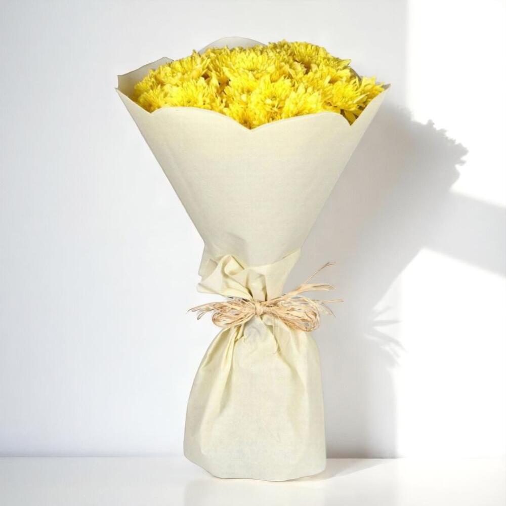 Добавьте радости и тепла в любой праздник с нашим букетом «Жёлтый день» — сияющей композицией из 20 свежих жёлтых хризантем. Этот яркий букет, символизирующий счастье, дружбу и позитив, станет идеальным подарком, который поднимет настроение кому-то. Будь то день рождения, жест благодарности или просто способ проявить заботу, эти яркие жёлтые цветы оставят неизгладимое впечатление. Красиво упакованный в натуральную крафт-бумагу и перевязанный рафией в деревенском стиле, этот букет обладает непреходящим и вдохновляющим очарованием, подходящим для любой обстановки. Сочная зелёная листва добавляет глубины и контраста, усиливая яркость хризантем. Инструкция по уходу: По прибытии подрежьте стебли по диагонали и поставьте цветы в чистую вазу, наполненную свежей водой. Обновляйте воду каждые 2–3 дня и удалите все листья ниже уровня воды, чтобы предотвратить размножение бактерий. Держите букет вдали от прямых солнечных лучей и источников тепла. При правильном уходе эти прекрасные цветы сохранят свежесть и яркость в течение нескольких дней.