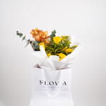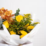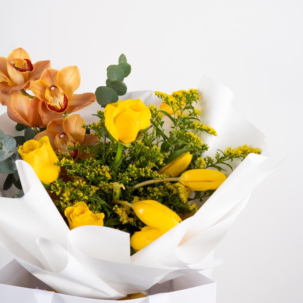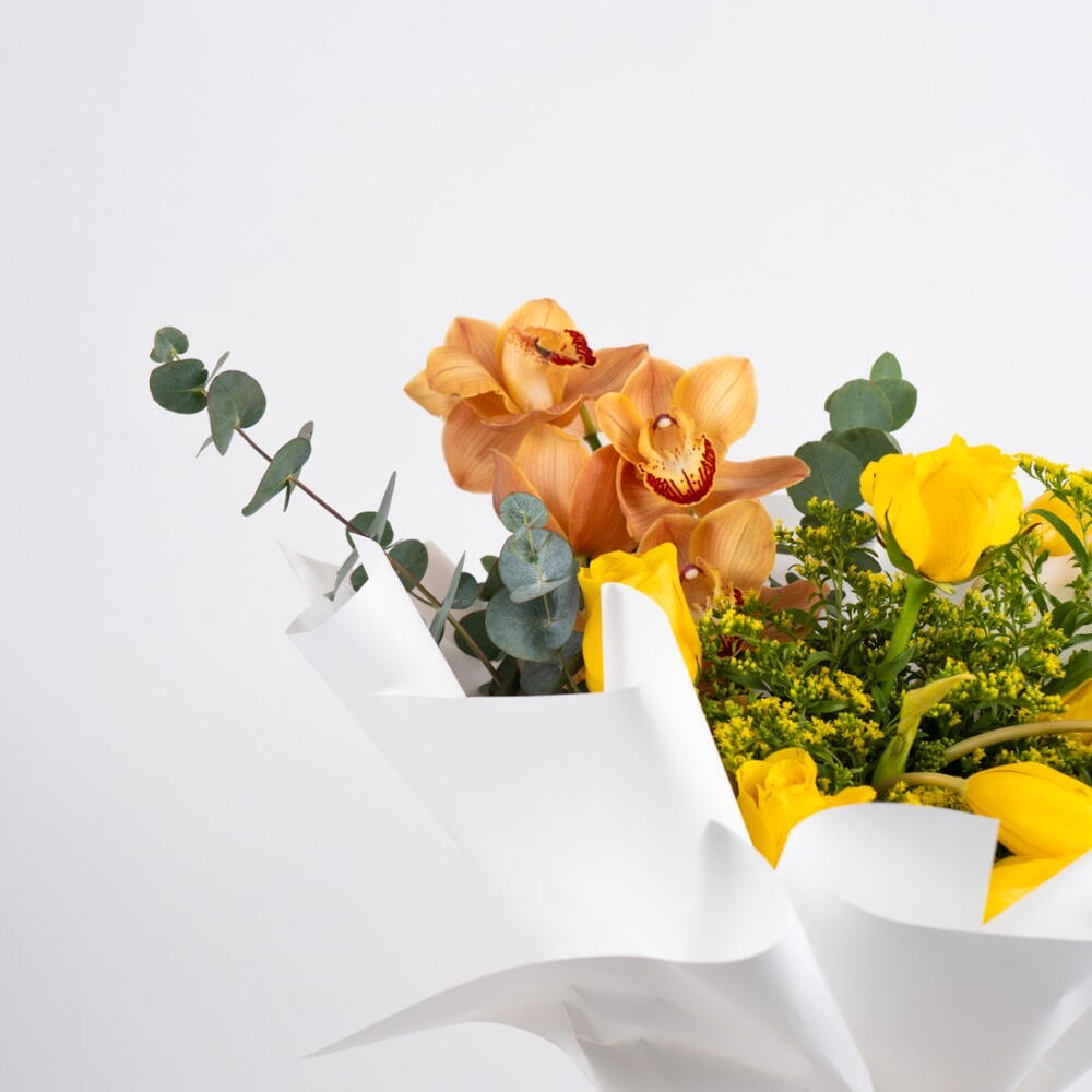 Tulips - 5 шт. Solidago - 5 шт. cymbidium - 1 шт. rose yellow - 3 шт.