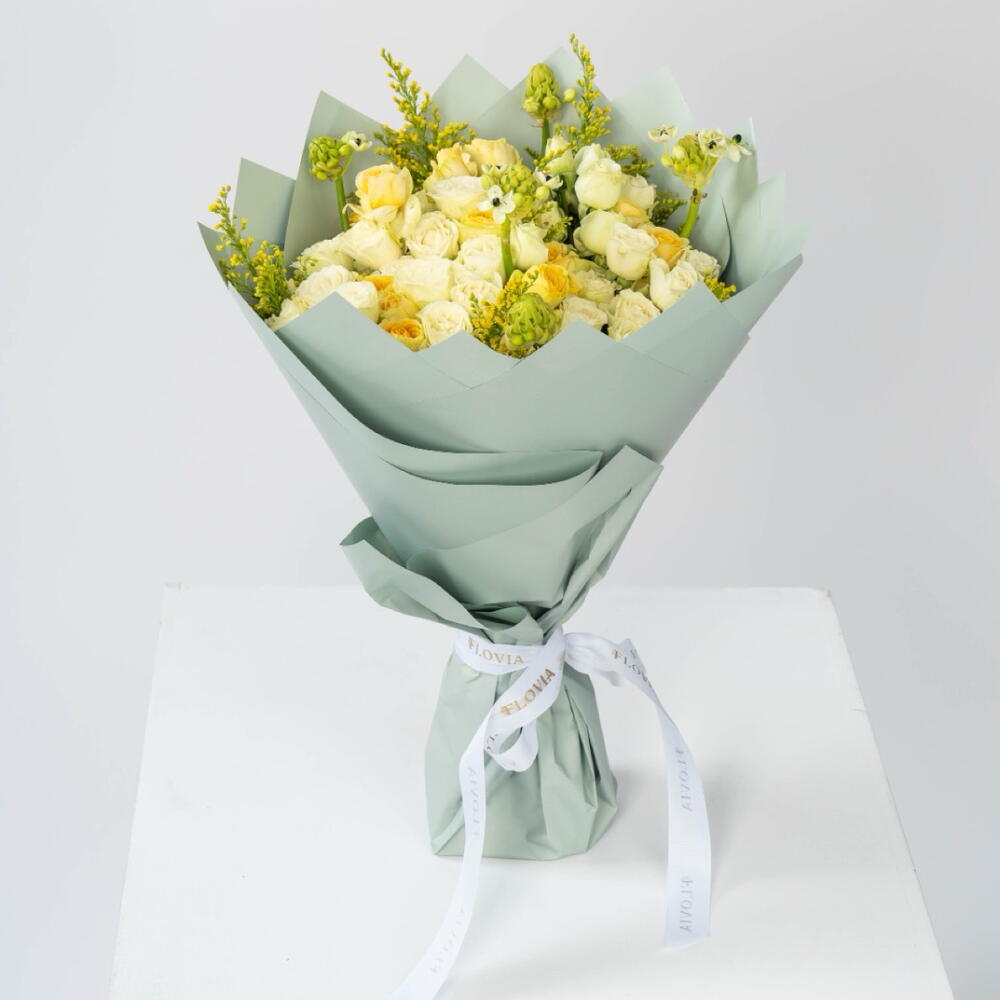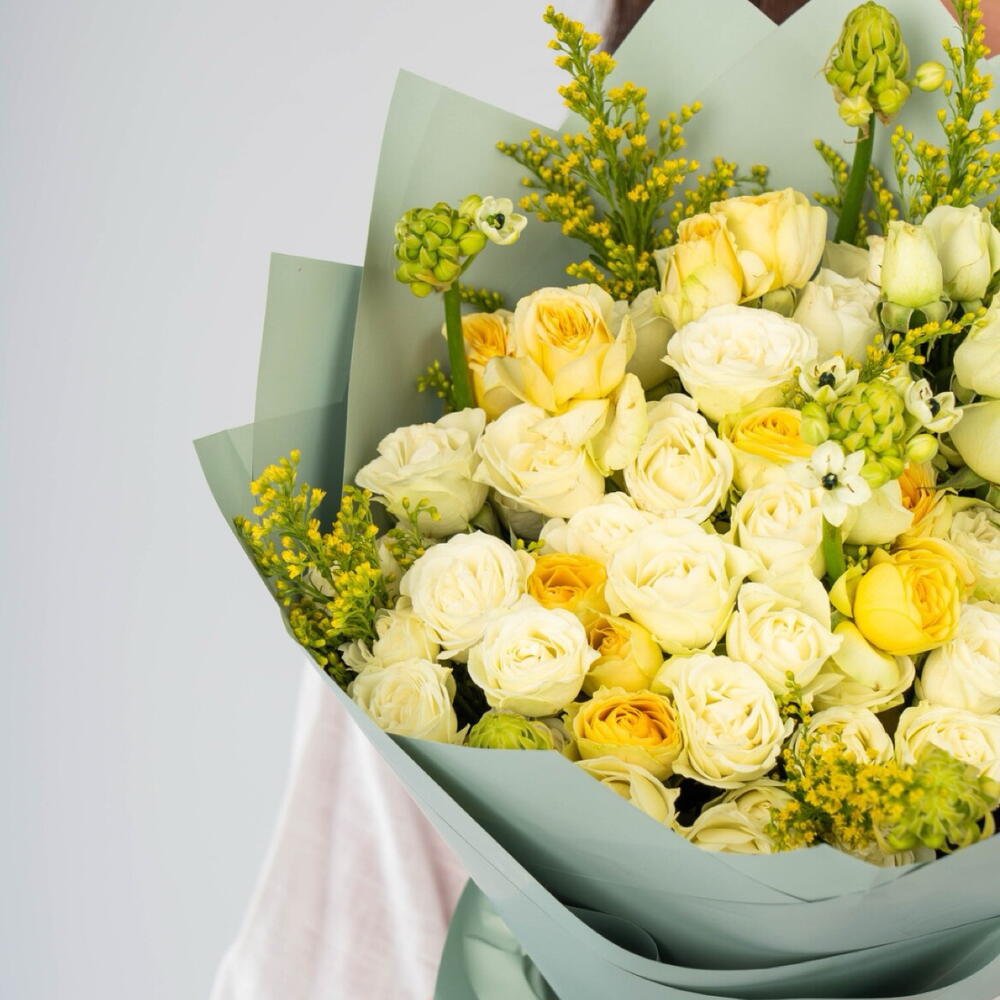 светло-жёлтые розы - 10 шт. тёмно-жёлтые розы - 10 шт. кремовые розы - 10 шт.