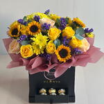 Композиция в коробке из 10 желтых роз, 4 персиковых роз, 4 подсолнухов и 2 желтых хризантем с 6 шоколадными конфетами Ferraro Rocher
