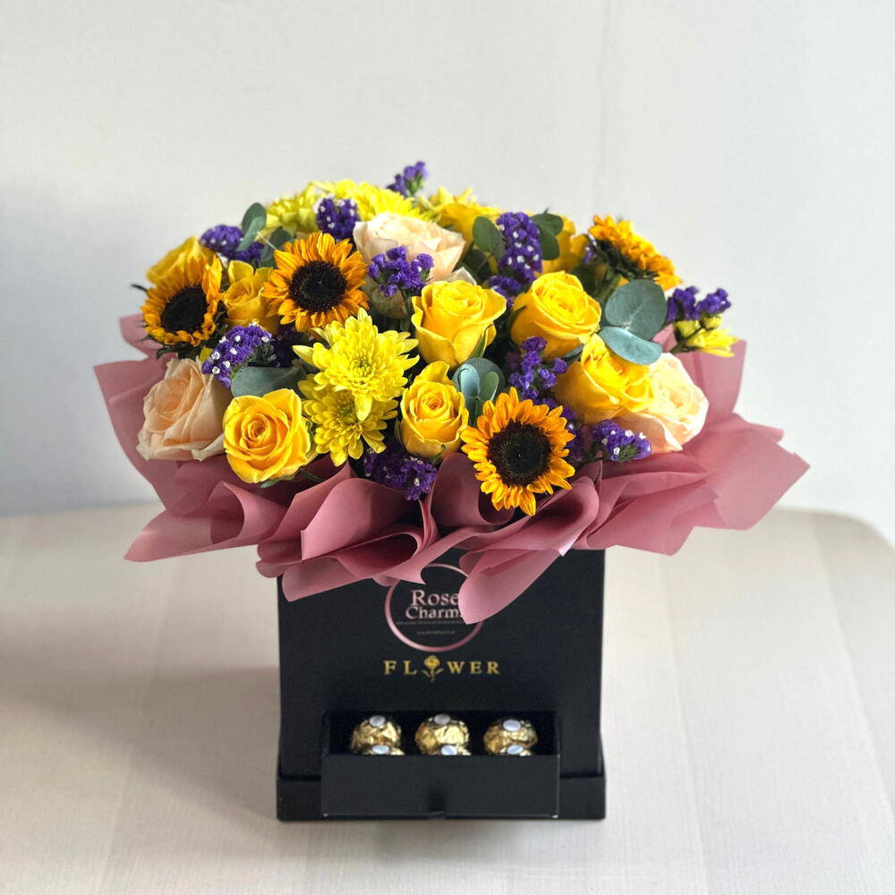 Композиция в коробке из 10 желтых роз, 4 персиковых роз, 4 подсолнухов и 2 желтых хризантем с 6 шоколадными конфетами Ferraro Rocher