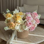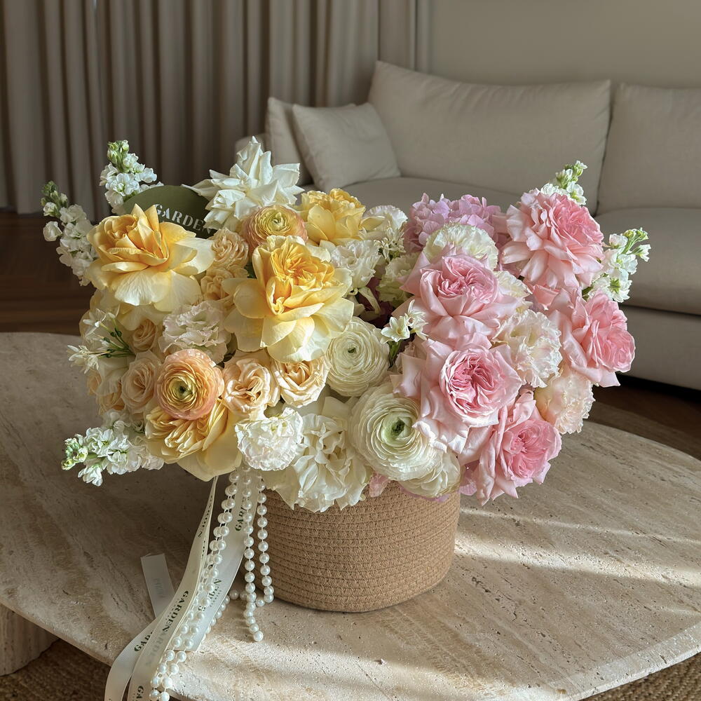 An elegant bouquet in a basket combines pastel shades of pink, peach, and yellow. Delicate roses, ranunculus, and matthiola create an atmosphere of sophistication and refined beauty. The perfect choice for those who appreciate harmony and style in every detail. Includes matthiola, hydrangea, eustoma, ranunculus, O’hara rose, Buttercup rose. The set comes with a personalized card, care instructions and flower fertilizer. *Flower delivery today Perfect for: - a gift for her; - weddings or anniversaries; - birthday; - perfect dates; - gift add-ons; - International Womens Day; - gifts with no occasion; - VIP events or luxury floral surprise.