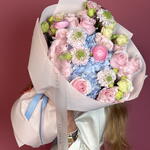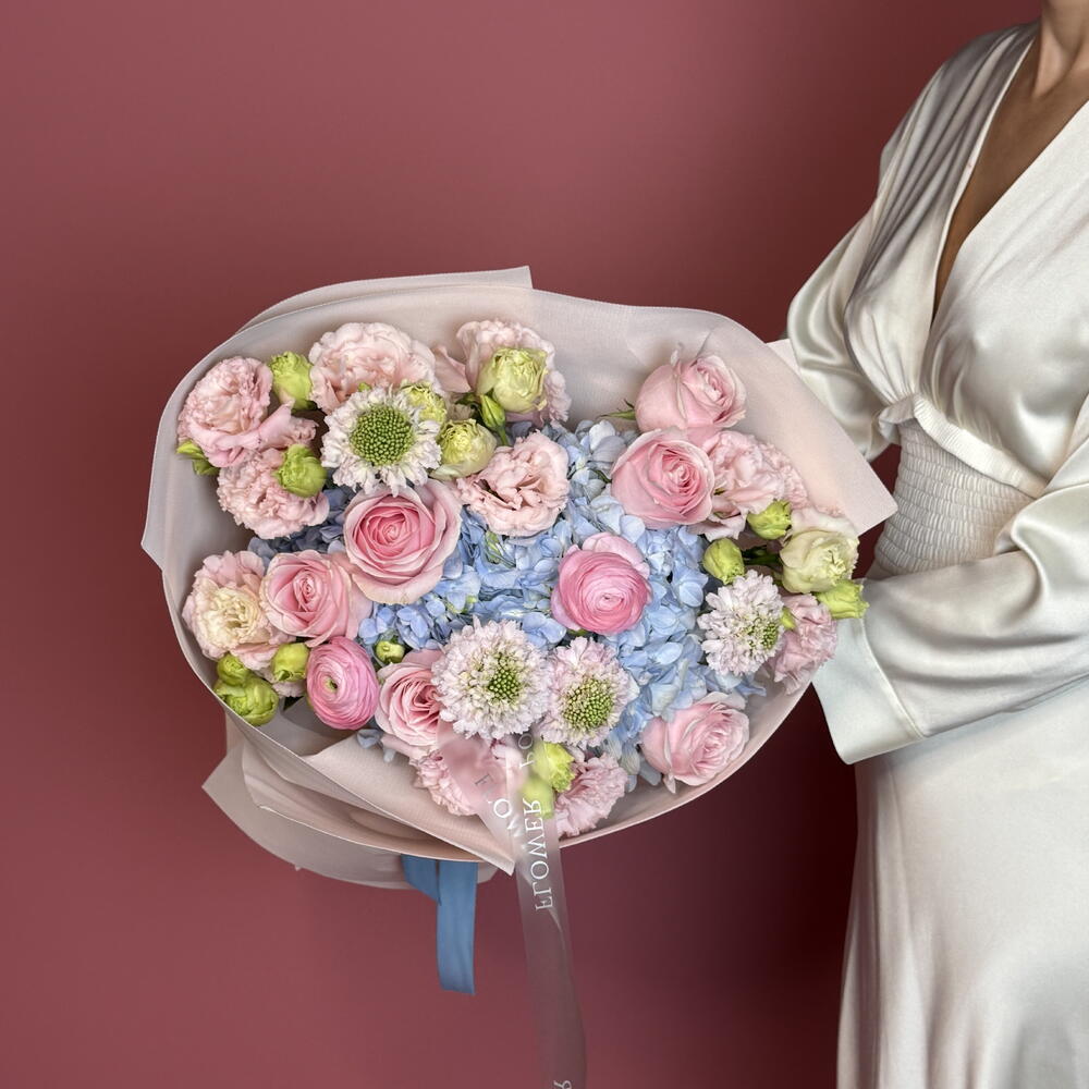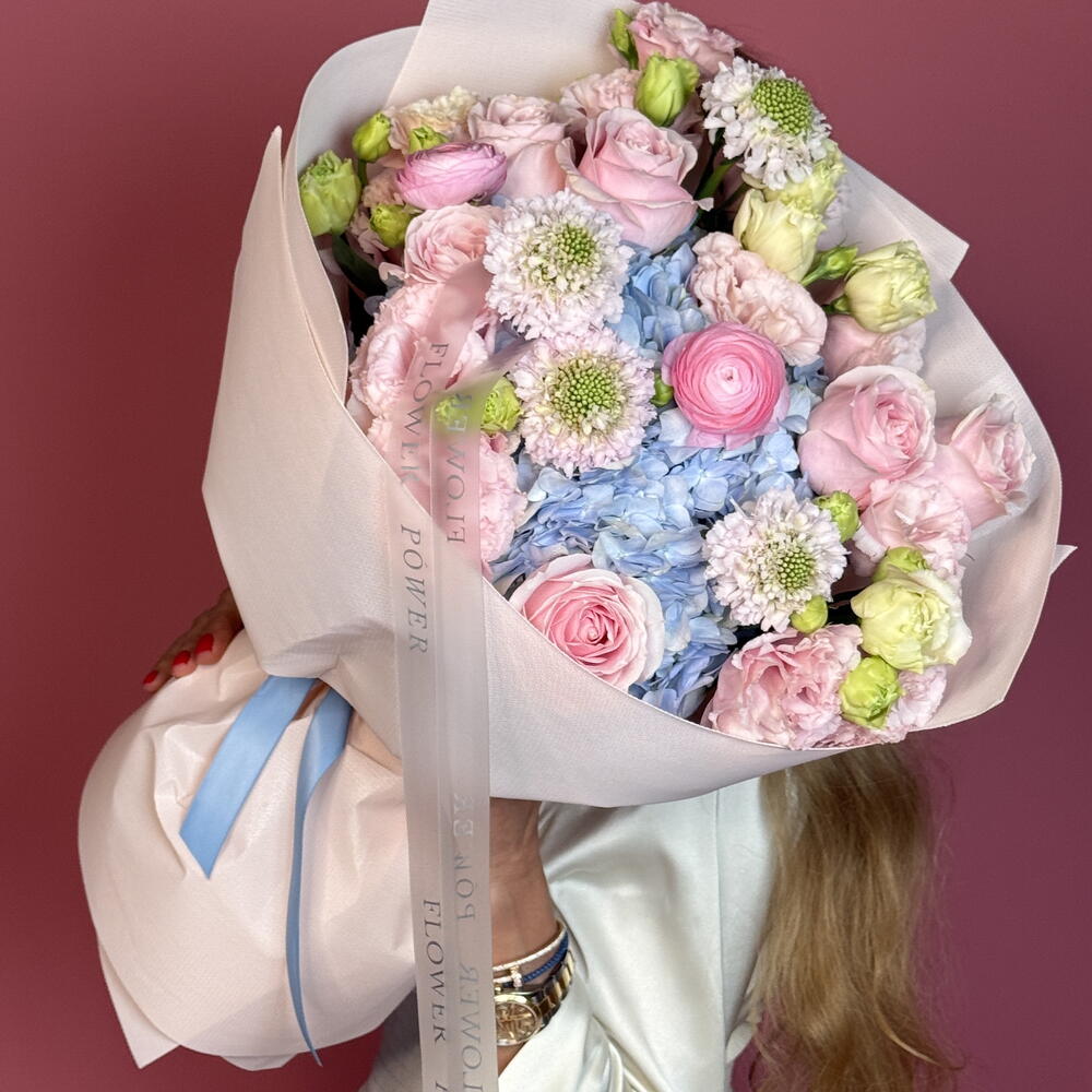 Изысканное и нежное сочетание гортензий, роз, эустомы и ранункулюсов. Этот пышный букет вызывает глубокое восхищение, радость и искреннюю признательность. Утончённый и продуманный подарок на дни рождения, годовщины или просто чтобы сказать «спасибо».