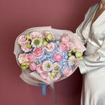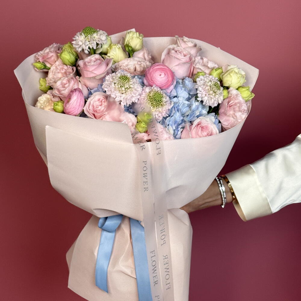 ranunculus pink - 3 шт. eustoma pink - 3 шт. hydrangea light blue - 2 шт. скабиоза розовая - 3 шт. сад роз светло-розовый - 5 шт.