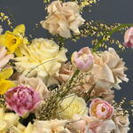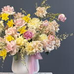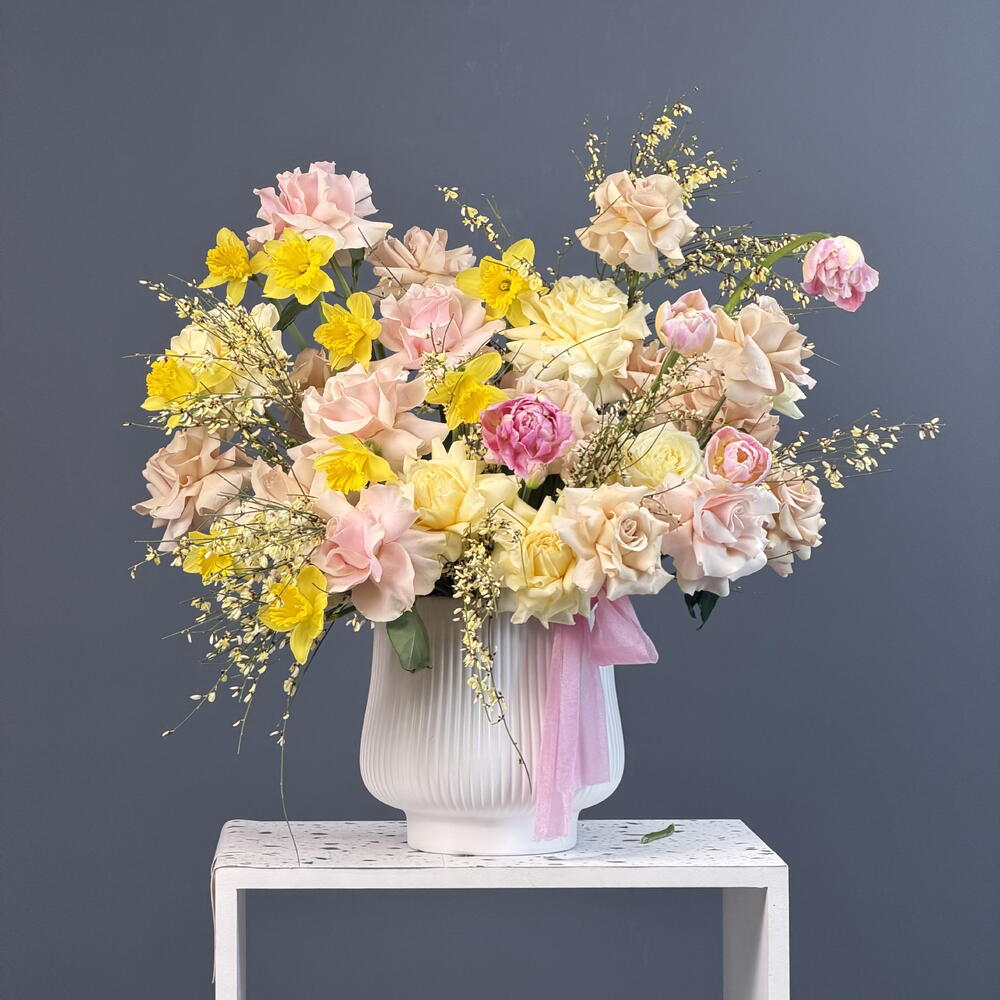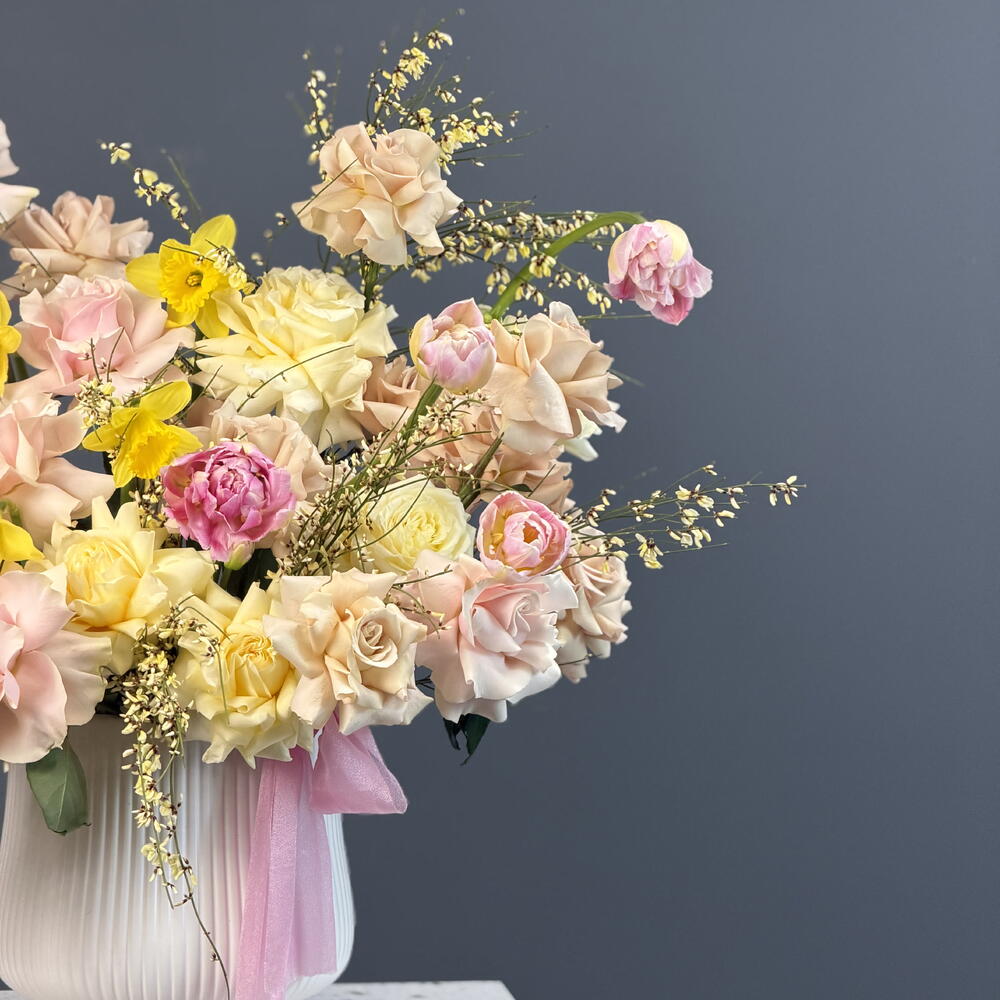 Эта сияющая композиция, воплощающая нежную элегантность и весеннее очарование, представляет собой гармоничное сочетание персиковых, нежно-розовых и маслянисто-желтых оттенков. В ней использованы отборные розы, нежные ранункулюсы и яркие нарциссы, каждый цветок тщательно подобран для создания легкого, воздушного дизайна в садовом стиле. Дополненная изысканными сезонными растениями и натуральными текстурами, композиция выглядит непринужденно грациозной и одновременно полной жизни. Помещенная в современную ребристую вазу и украшенная нежно-розовой лентой, эта композиция передает красоту новых начинаний и теплого солнечного света. Идеально подходит для дней рождения, праздников или просто для того, чтобы поднять кому-то настроение, эта композиция — вневременное выражение радости, женственности и утонченной роскоши.