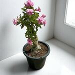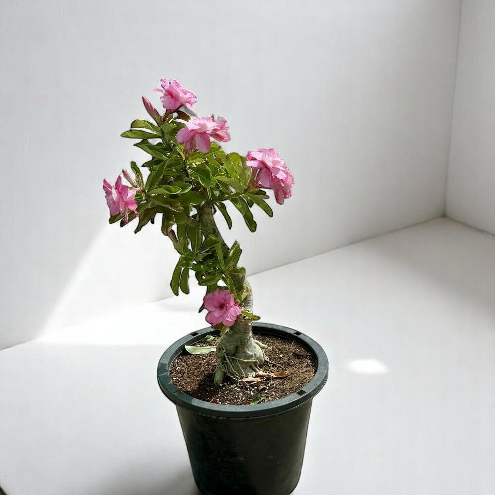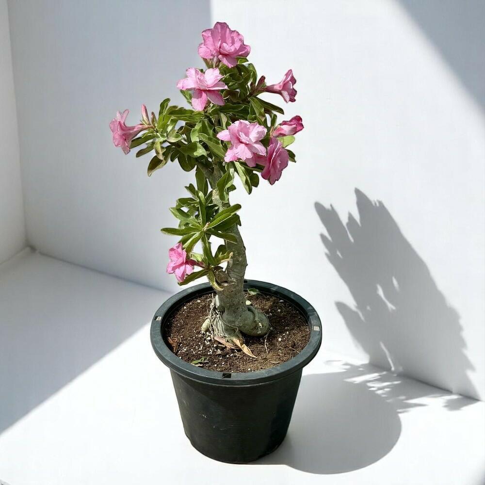 Adenium Obesum, или пустынная роза, — эффектное растение со скульптурным стволом и пышными розовыми цветами в форме трубы. Это уникальное растение сочетает в себе грубую привлекательность суккулента и изящество цветущего бонсай. Его толстый каудекс и скрученная форма добавляют драматичную архитектурную выразительность, а цветы дарят взрыв тропических красок. Идеально для размещения в помещении или на открытом воздухе, оно приносит в любую коллекцию растений и и выносливость, и красоту.