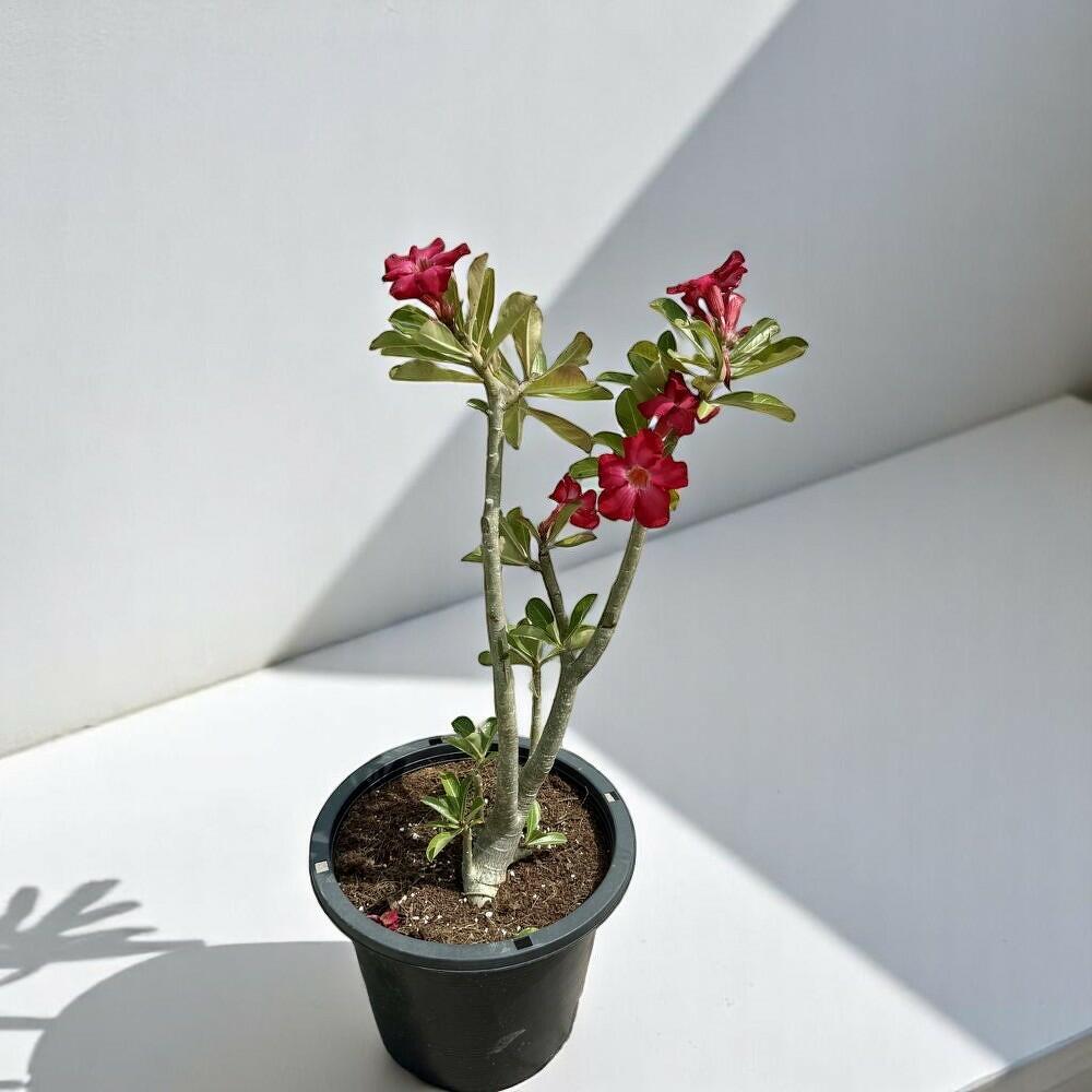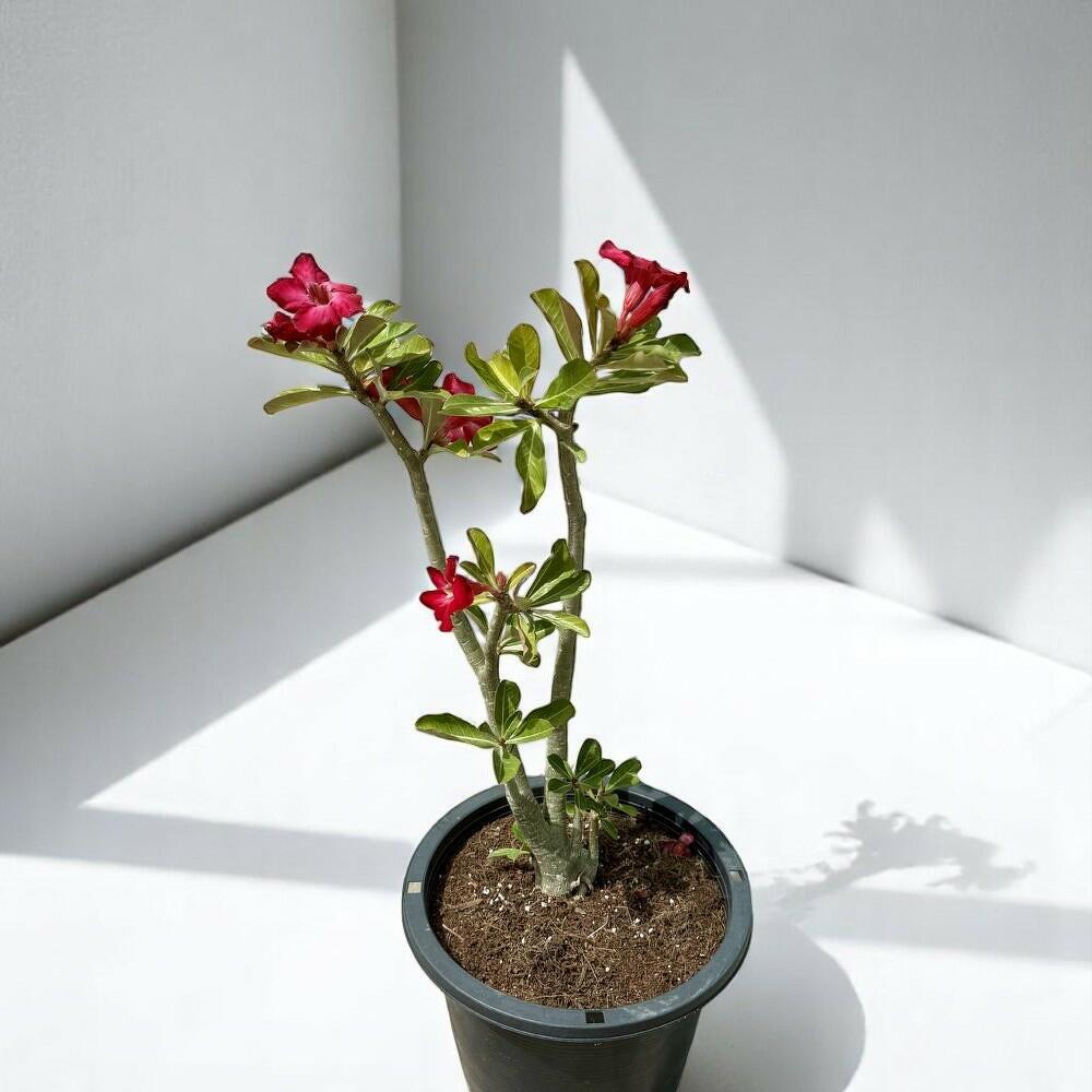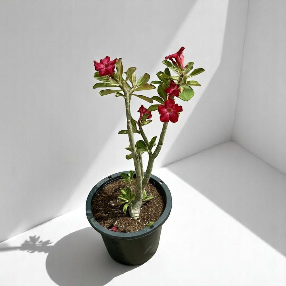 Адениум обесум, также известный как пустынная роза, — эффектное декоративное растение, прославившееся своими смелыми, яркими цветами и скульптурным стволом. У этой разновидности глубокие красные цветки, которые выделяются на фоне мягких зелёных листьев и уникальной каудексной основы. Его минималистичное ветвление и бонсайная привлекательность делают его заметным дополнением любого подоконника, письменного стола или патио. Элегантный, выносливый и неприхотливый, он идеален как для начинающих, так и для опытных любителей растений.