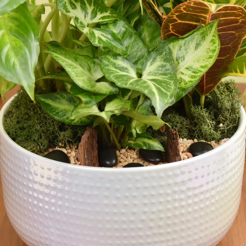1 растение белого сингониума 1 растение спатифиллума 1 растение кротона Петра 1 растение диффенбахии Оформлено в белом керамическом горшке с белыми камнями