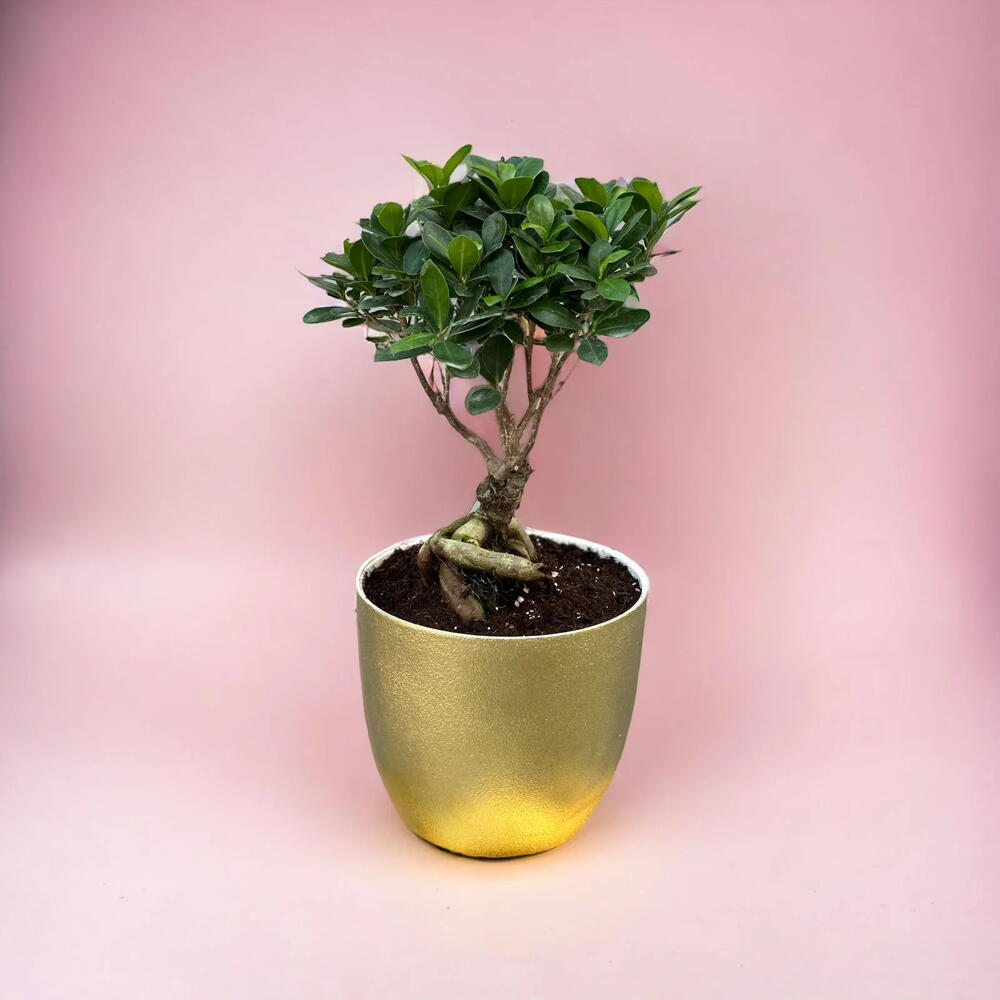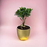 Этот бонсай в горшке — очаровательное миниатюрное деревце, воплощающее гармонию, равновесие и художественную красоту. Благодаря изящно изогнутому стволу и пышной зелёной листве, оно воплощает в себе частичку природной элегантности в компактной форме. Этот бонсай, посаженный в стильный золотой горшок, излучает изысканность и станет прекрасным украшением любого интерьера. Идеально подходит для подарка или личного пользования, символизируя терпение, заботу и спокойствие, что делает его вневременным дополнением к любому интерьеру.