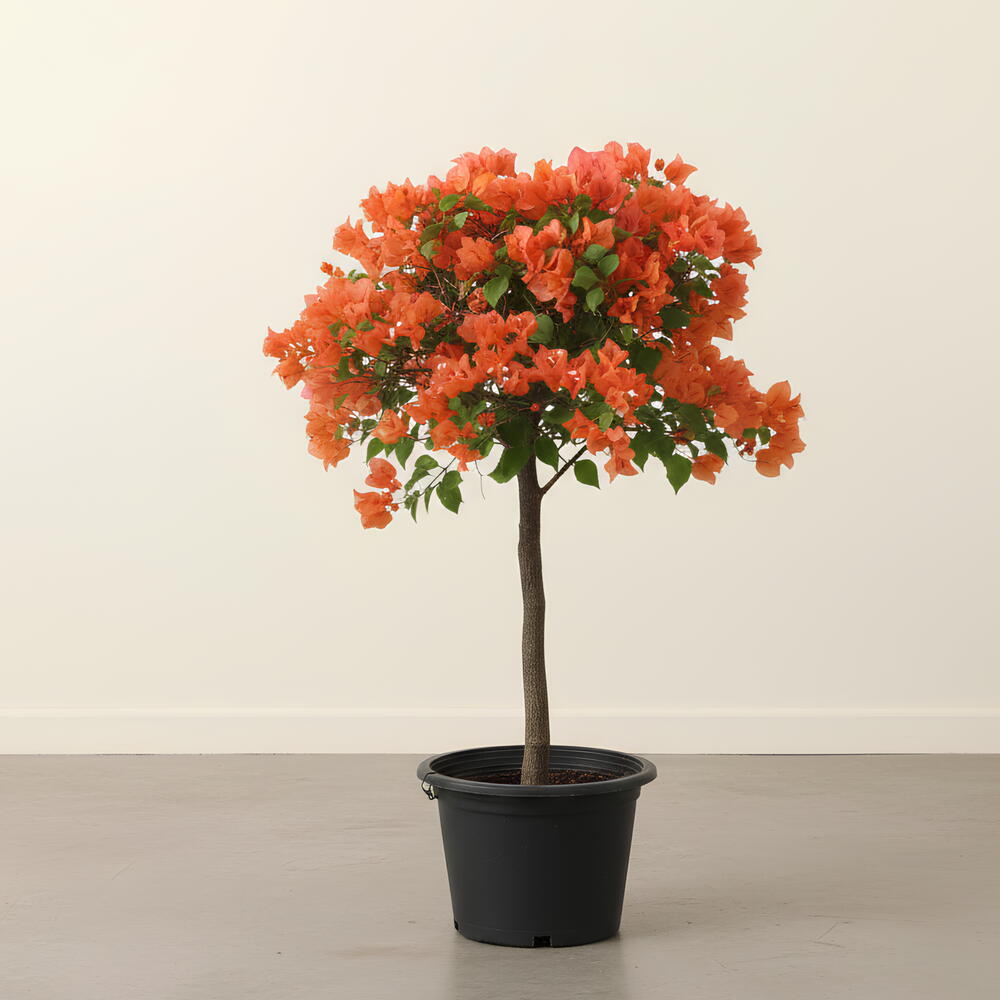 Стандартное дерево бугенвиллеи яркого оранжевого цвета — эффектное декоративное растение с чётко выраженным одиночным стволом, увенчанным пышной округлой кроной ярких цветов. Его яркие бумажные прицветники создают смелый средиземноморский образ, что делает его идеальным для патио, входных зон и солнечных интерьеров.