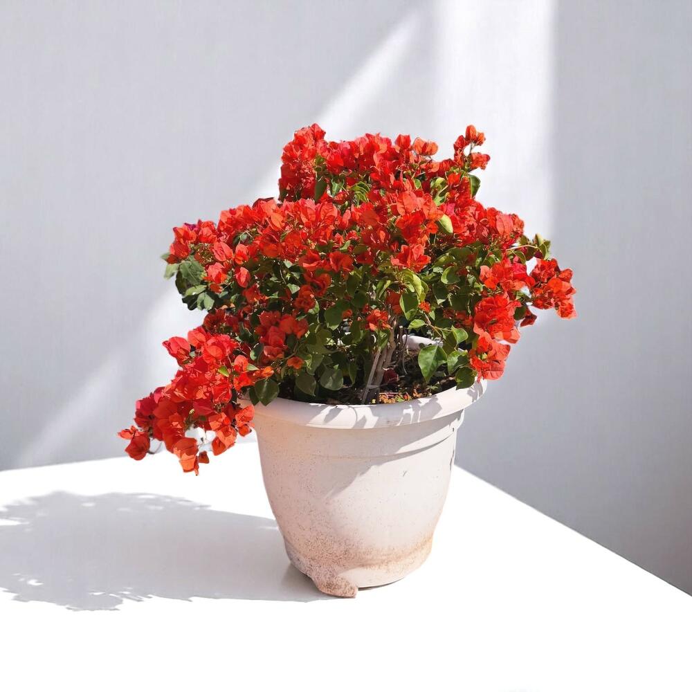 Добавьте огненный взрыв цвета в ваш дом или сад с этой потрясающей бугенвиллеей. Её пламенно-красные прицветники создают эффектную цветочную композицию, которая мгновенно придаёт энергию любому пространству. Будь то размещённая в помещении у яркого окна или на улице на полном солнце, это растение придаёт тропический шарм и драматичную красоту. Это выносливое растение, которое хорошо растёт при минимальном уходе и дарит цветение на протяжении нескольких месяцев. Идеально для патио, балконов или в качестве подарка, чтобы впечатлить любого любителя растений. Её пышный, стелющийся характер делает её идеальной для декоративных контейнеров или в качестве каскадного акцента. Обязательна для поклонников ярких, эффектных растений.