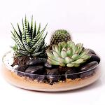 Набор из 3 растений Названия растений: хавортия, зелёная эхеверия и кактус Одно прозрачное стеклянное блюдо с чёрными камнями и другими предметами Размер блюда [В x Г]: примерно 9,5 x 24 см Интересные факты о растениях: Стебель кактуса покрыт восковым веществом, которое предотвращает испарение воды. Существует более 2000 разновидностей кактусов, различающихся по цвету, форме и виду.