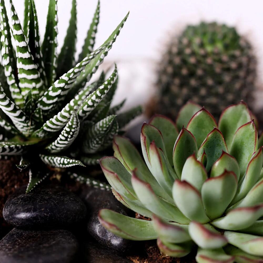 Набор из 3 растений Названия растений: хавортия, зелёная эхеверия и кактус Одно прозрачное стеклянное блюдо с чёрными камнями и другими предметами Размер блюда [В x Г]: примерно 9,5 x 24 см Интересные факты о растениях: Стебель кактуса покрыт восковым веществом, которое предотвращает испарение воды. Существует более 2000 разновидностей кактусов, различающихся по цвету, форме и виду.