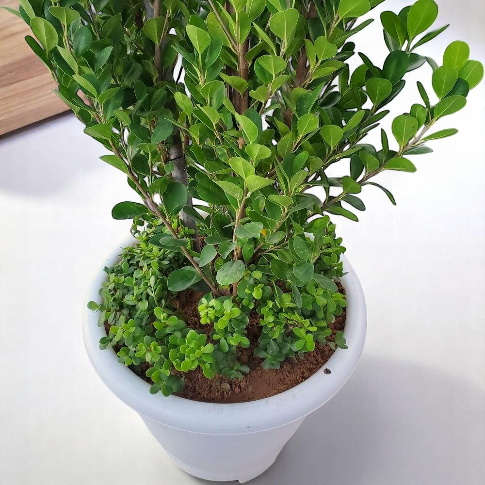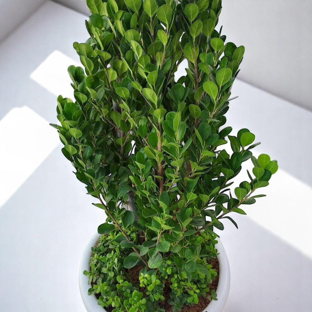 Добавьте нотку вечнозеленой элегантности в ваше пространство с этим очаровательным фикусом. Его компактная форма и насыщенная зеленая листва делают его любимцем как для дома, так и для офисных интерьеров. Посаженный в стильный белый горшок и украшенный стелющимся почвопокровным растением, этот фикус создаёт успокаивающую, свежую атмосферу в любом месте. Это неприхотливый компаньон, который очищает воздух и улучшает эстетику любой комнаты.