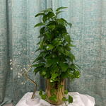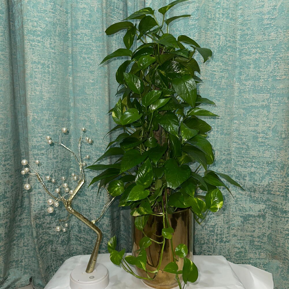 Этот красивый и элегантный потос (денежное растение), помещённый в премиальный золотой керамический горшок, придаёт роскошный и стильный акцент любому столу в доме или офисе. Блестящий золотой горшок подчёркивает общий вид, что делает его идеальным предметом декора для современных интерьеров. Потос — неприхотливое, легкорастущее комнатное растение, идеально подходит как для новичков, так и для любителей растений. По фэн-шуй считается, что денежное растение привлекает удачу, процветание и позитивную энергию, а золотой горшок символизирует богатство и благополучие, что делает его отличным выбором для подарка или личного использования. Это растение не только украшает ваше пространство, но и приносит ощущение свежести, гармонии и позитива в ваше окружение.
