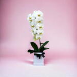 Белая орхидея фаленопсис — впечатляющее воплощение вечной элегантности и природной красоты. Её безупречно белые цветы изящно ниспадают, каждый лепесток украшен мягким жёлтым и красным центром, создавая поразительный контраст. Поддерживаемая пышной зелёной листвой, эта фаленопсис одновременно утончённа и спокойна. Размещённая в стильном белом горшке, украшенном чёрной лентой, она станет изысканным подарком или элегантным дополнением любого интерьера. Эта орхидея символизирует чистоту, грацию и спокойствие, что делает её идеальной для особых случаев или просто для того, чтобы украсить пространство своей нежной прелестью.