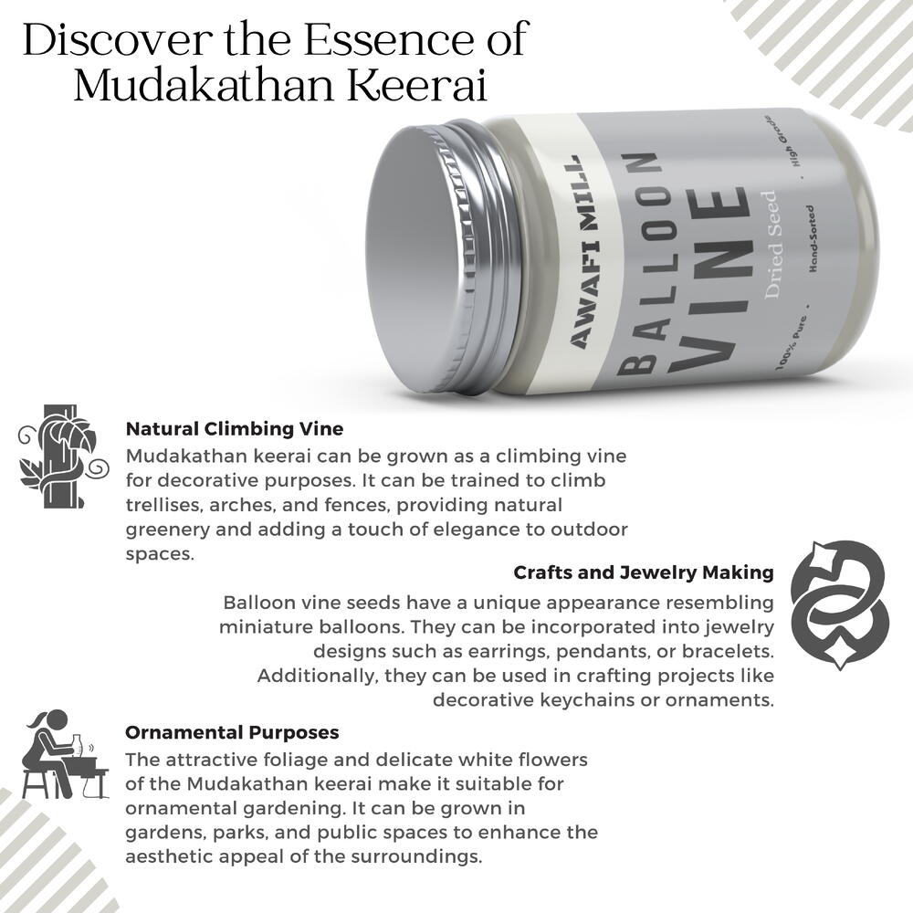Awafi Mill приносит вам природное оздоровительное чудо — семена Balloon Vine, также известные как Mudakathan Keerai или семена Cardiospermum Halicacabum. Прославленные своими потенциальными полезными свойствами в разных культурах, Mudakathan Keerai — традиционное благо, выдержавшее испытание временем. Эти семена богаты антиоксидантами, способствующими общему благополучию и поддерживающими здоровый образ жизни. Оцените универсальность семян Balloon Vine, добавляя их в рацион в виде супов, рагу или травяных настоев для целостного подхода к оздоровлению. Awafi Mill обеспечивает свежесть и чистоту каждого семени, доставляя лучшее от природы в ваше путешествие к здоровью. Откройте для себя природную пользу и потенциальные полезные свойства семян Balloon Vine вместе с Awafi Mill.
