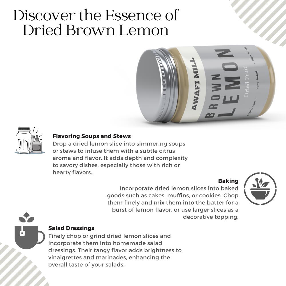 Awafi Mill с гордостью представляет свой высушенный лимон первой категории в завораживающем коричнево-жёлтом оттенке, созданный до совершенства для кулинарных энтузиастов в ОАЭ. Известный своей приверженностью совершенству, Awafi Mill предлагает премиальный цитрусовый опыт, который поднимает вкус ваших любимых блюд. Совершенство Awafi Mill: Окунитесь в превосходное качество высушенного лимона первой категории от Awafi Mill. Наша приверженность совершенству гарантирует, что каждый ломтик воплощает истинную сущность цитруса, устанавливая новый стандарт кулинарного наслаждения. Универсальное кулинарное чудо: коричнево-жёлтый высушенный лимон Awafi Mill — универсальное открытие, обогащающее множество блюд своим богатым и пикантным вкусом. От традиционных эмиратских рецептов до современных творений этот кулинарный драгоценный камень приносит взрыв цитрусовой яркости в каждый укус. Любимый шеф-поварами ОАЭ: Узнайте, почему уважаемые шеф-повара в ОАЭ доверяют высушенному лимону Awafi Mill, чтобы придать своим кулинарным шедеврам отличительную ноту. Поднимите своё кулинарное мастерство до профессионального уровня с тем же проверенным ингредиентом, которым дорожат гастрономические эксперты. Продлённая свежесть, без компромиссов во вкусе: Наслаждайтесь удобством увеличенного срока хранения, не жертвуя исключительным вкусом и ароматом премиального высушенного лимона Awafi Mill. Держите это кулинарное сокровище под рукой на случай, когда вас посетит вдохновение.