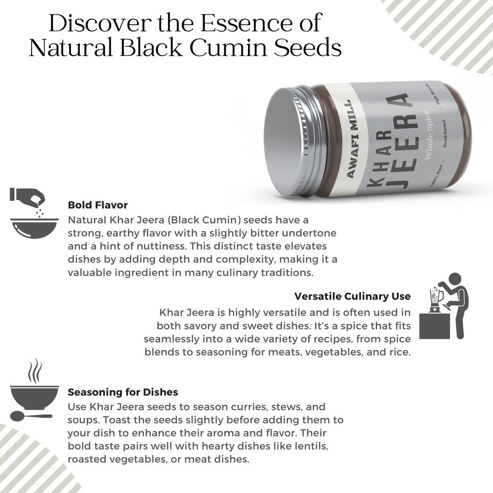 Отправьтесь в путешествие к гармоничному благополучию с Awafi Mill Khar Jeera Ayurveda — тщательно приготовленной смесью, в которой представлены Kali Jeeri, Shahi Jeera и натуральные семена черного тмина. Известная под различными названиями, такими как Kala Jeera, Syah Jira, Shah Jeera и Bitter Cumin, эта универсальная специя не только придаёт вашим кулинарным творениям уникальную ароматную нотку, но и раскрывает мощные целебные свойства Аюрведы. Прославленная в Аюрведе на протяжении веков, Khar Jeera — это не просто кулинарный шедевр; это мощный помощник для пищеварения. Известная своими пищеварительными свойствами, Khar Jeera способствует перевариванию и поддерживает здоровье кишечника, что делает её ценным дополнением к вашему режиму заботы о здоровье. Awafi Mill обеспечивает премиальное качество Khar Jeera Ayurveda, получая её из лучших семян черного тмина и гарантируя её чистоту и подлинность.