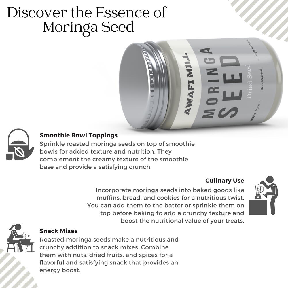 Awafi Mill предлагает вам чудо природы — 100% натуральные семена моринги, питательная мощь, насыщенная необходимыми питательными веществами. Эти семена являются богатым источником витаминов, минералов и антиоксидантов, обеспечивая естественную поддержку вашего общего самочувствия. Благодаря универсальности применения семена моринги можно добавлять в рацион: смешивать в смузи, добавлять в салаты или употреблять как питательный перекус. Awafi Mill гарантирует свежесть и чистоту каждого семечка, доставляя лучшее от природы прямо к вашей двери. Восхищайтесь чудесами моринги с каждым семечком — это полезное дополнение к вашему ежедневному рациону.
