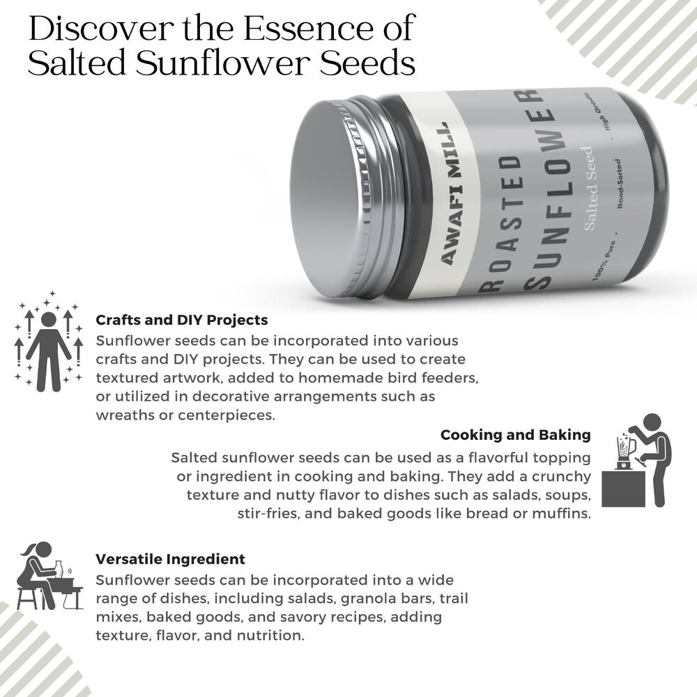 Awafi Mill представляет обжаренные подсоленные семечки подсолнуха — хрустящую и пикантную закуску, идеально подходящую для утоления ваших желаний. Эти ядра подсолнечника обжарены до совершенства, обеспечивая премиальное качество и богатый вкусовой профиль. Наслаждайтесь хрустящей текстурой и пикантным вкусом обжаренных подсоленных семечек подсолнуха, приправленных именно в меру соли для полноценного удовольствия от перекуса. Независимо от того, перекусываете ли вы в пути, устраиваете пикник или принимаете гостей, эти семечки — удобный и вкусный выбор. Помимо перекусов, хрустящие ядра подсолнечника универсальны и могут использоваться в качестве посыпки для салатов, йогурта или добавляться в выпечку для дополнительной текстуры и вкуса. Обжаренные подсоленные семечки Awafi Mill предлагают хрустящий и насыщенный вкусовой опыт, который подходит для любого случая. Упакованные с заботой для сохранения свежести и аромата, эти семечки — удобная и приятная закуска, которая наверняка порадует ваши вкусовые рецепторы. Поднимите уровень своих перекусов с хрустящей и пикантной прелестью обжаренных подсоленных семечек подсолнуха Awafi Mill.