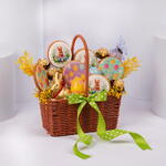Сделайте Пасху ещё более приятной с этим праздничным набором, наполненным сладостями и радостными сезонными акцентами. Оформленный в очаровательной плетёной корзине, этот подарок включает вкусные шоколадные конфеты, украшенное печенье и игривые пасхальные элементы, такие как разноцветные яйца и акцент в виде бабочки. Завершённый яркой зелёной лентой и яркими жёлтыми акцентами, он — идеальное сочетание сладости, цвета и праздничного настроения.