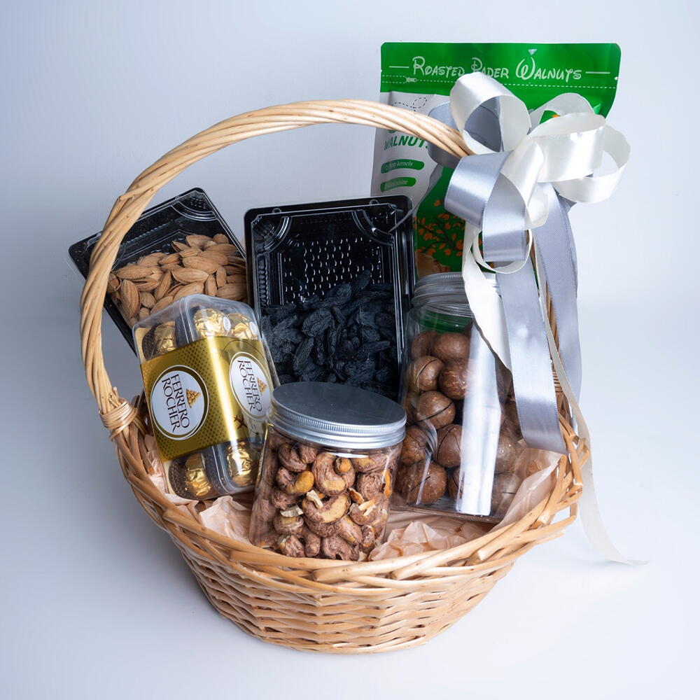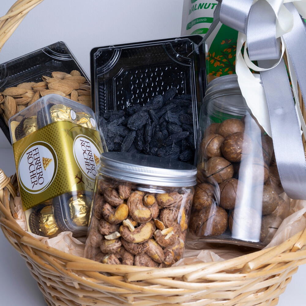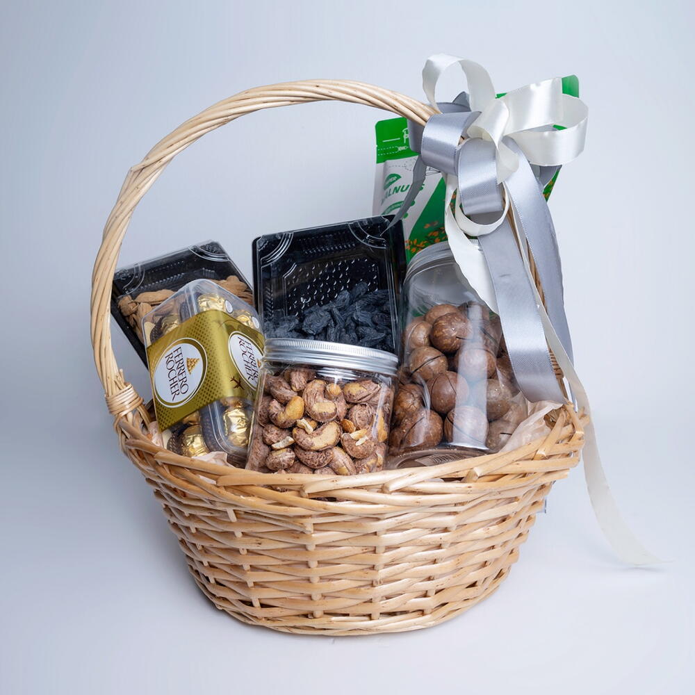 деревянная корзина - 1 шт. кешью 250 г - 1 шт. изюм узбекистан 300 г - 1 шт. жареный миндаль 300 г - 1 шт. орехи макадамии китай пакет - 1 шт. шоколад с грецкими орехами пакет - 1 шт. ferrero rocher шоколадные конфеты упаковка - 1 шт.