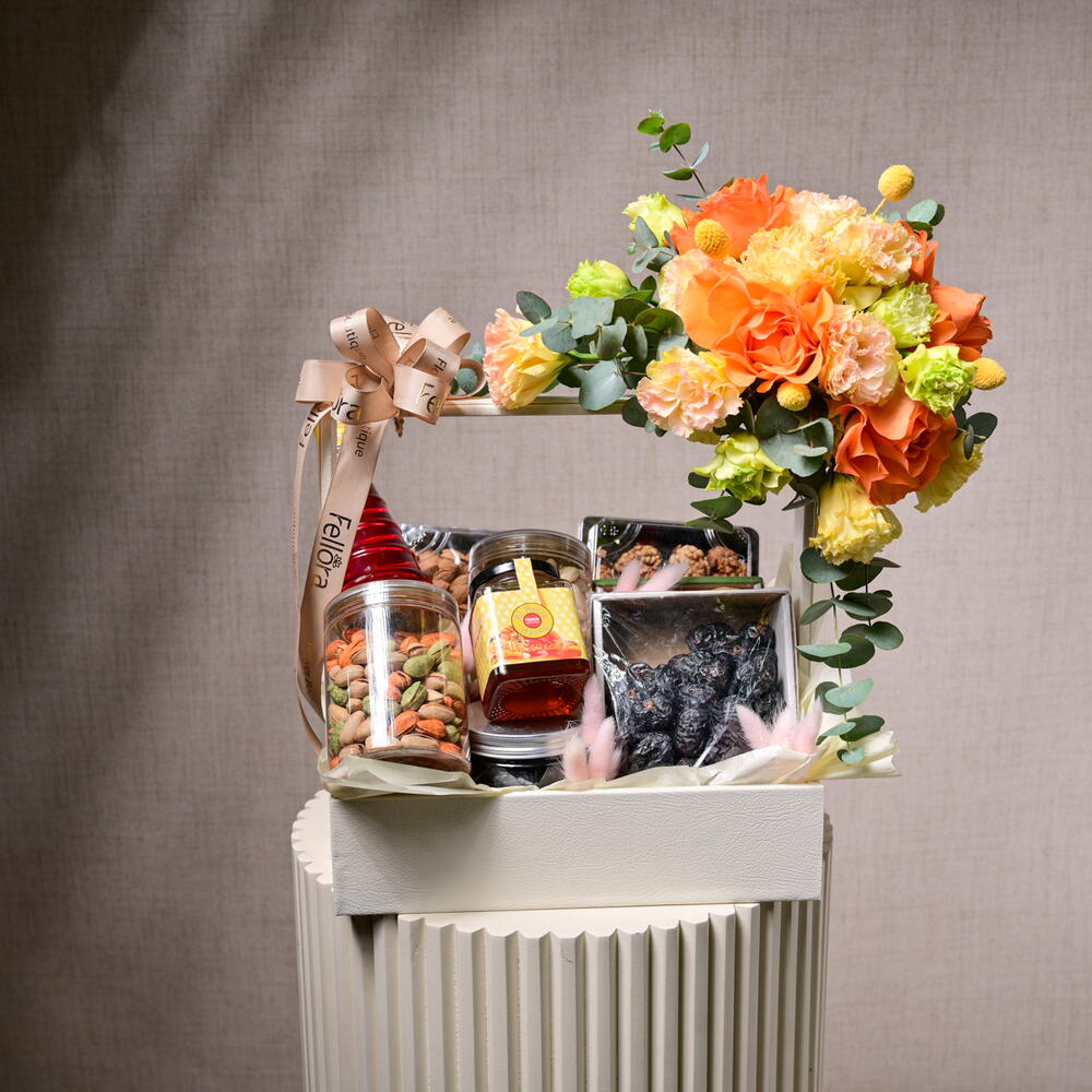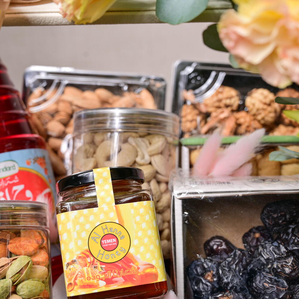 Ribbon - 1 шт. honey - 250 гр. raisins - 350 гр. figs - 500 гр. walnuts - 275 гр. орехи кешью - 300 гр. цветочная композиция в коробке - 1 шт. финики аджва - 500 гр. жареный миндаль - 325 гр. микс фисташек - 250 гр. Рух Афза - 800 мл