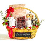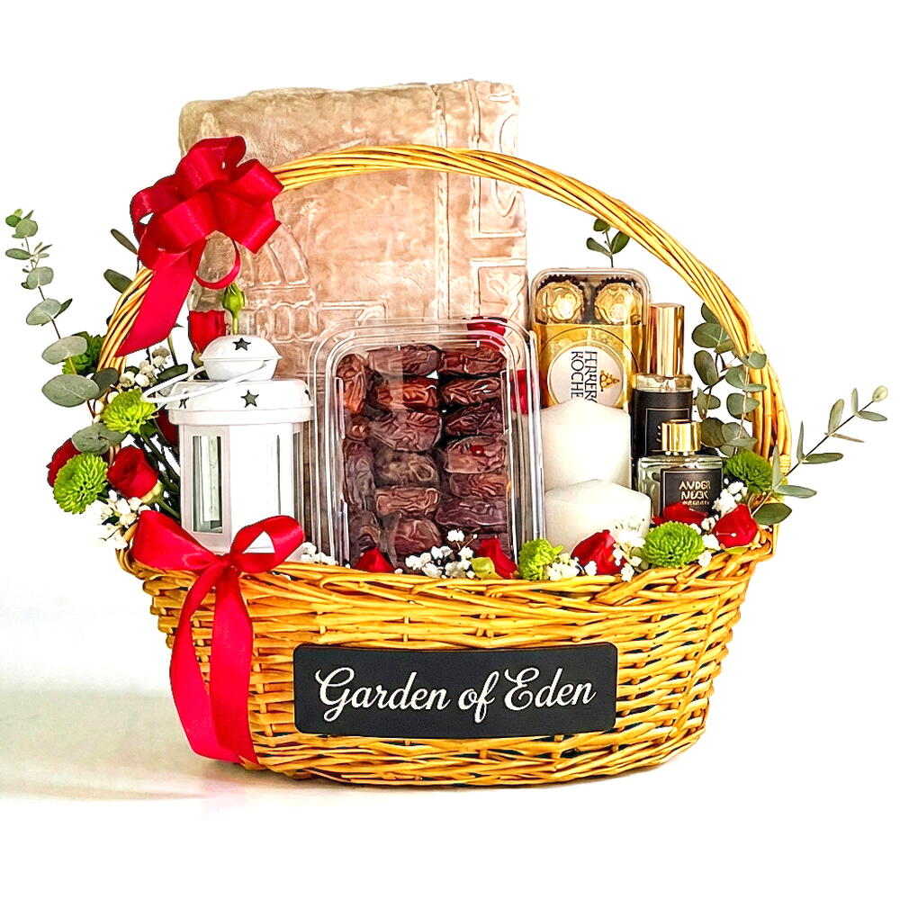 Значимый подарок к Рамадану, созданный, чтобы отражать веру, мир и единение. Эта элегантная подарочная корзина включает отобранные вручную финики, успокаивающий мускусный аромат, ароматическую свечу, традиционный фонарь, свежие цветочные акценты и молитвенный коврик с шоколадом Ferrero Rocher — всё красиво оформлено в классической корзине. Идеальный выбор, чтобы поделиться благословениями в священный месяц Рамадан.