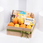 oranges - 4 шт. lemon - 3 шт. корень имбиря - 1 шт. пакет коричневых рисовых крекеров hunters - 1 шт. бутылка мёда Rowse - 1 шт. пакет имбирно-лимонного чая alokozay - 1 шт. пакет леденцов Strepsils мёд-лимон - 1 шт.