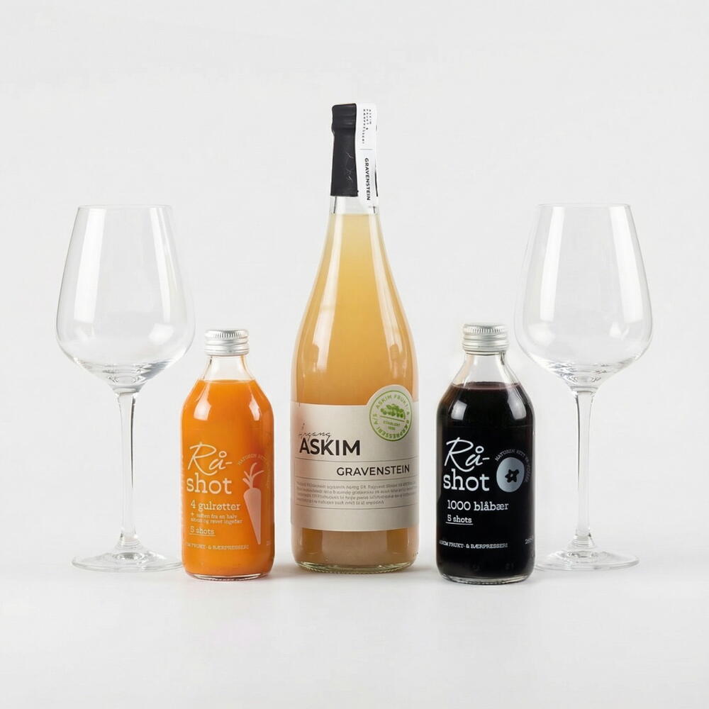 hadeland odessy allround crystal glasses 56cl - 2 pcs askim vintage gravenstein apple juice - 1 pcs raw blueberry shot 260ml - 1 pcs raw carrot shot 260ml - 1 pcs