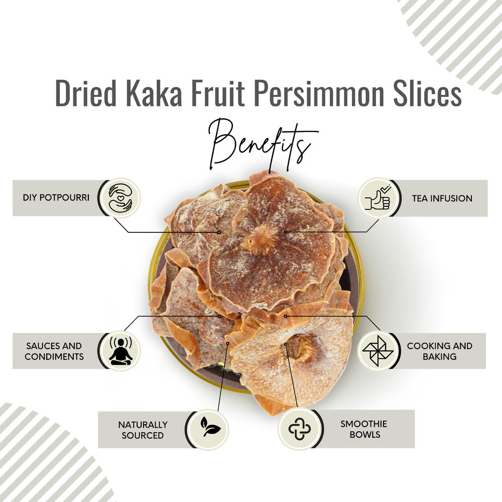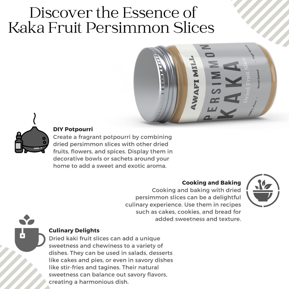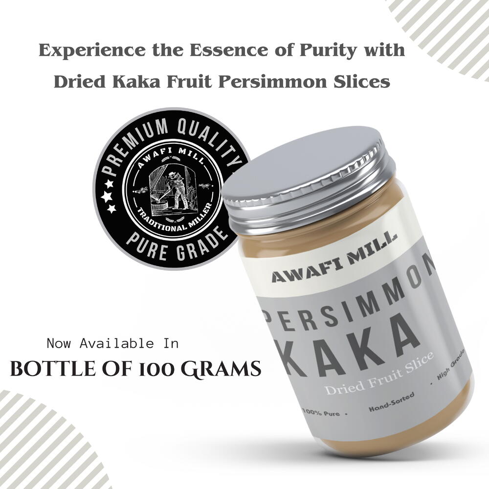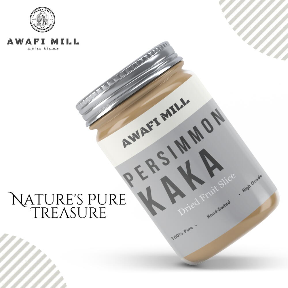 Awafi Mill introduces a delectable treat with our Dried Kaka Fruit Persimmon Slices, crafted with 100% natural ingredients to provide you with a wholesome snacking experience. Meticulously prepared, these slices capture the essence of the Kaka Fruit, delivering a premium quality product that is both sweet and flavorful. Our persimmon slices are a testament to exquisite craftsmanship, ensuring that each piece reflects the pure and natural goodness of the fruit. Free from additives, preservatives, or artificial flavors, Awafi Mill’s commitment to natural ingredients shines through in every bite. Indulge in the natural sweetness and rich flavor of Kaka Fruit Persimmon Slices, perfect for on-the-go snacking or as a versatile addition to trail mixes and recipes. The slices are dried to perfection, achieving an ideal balance between chewiness and a satisfying crunch. Packaged with care, our persimmon slices retain their freshness, allowing you to enjoy a guilt-free snacking experience. The beautiful presentation makes this product an attractive addition to your pantry and an ideal choice for thoughtful gifting. Embark on an authentic flavor journey with Awafi Mill’s Dried Kaka Fruit Persimmon Slices, and savor the natural goodness that nature has to offer.