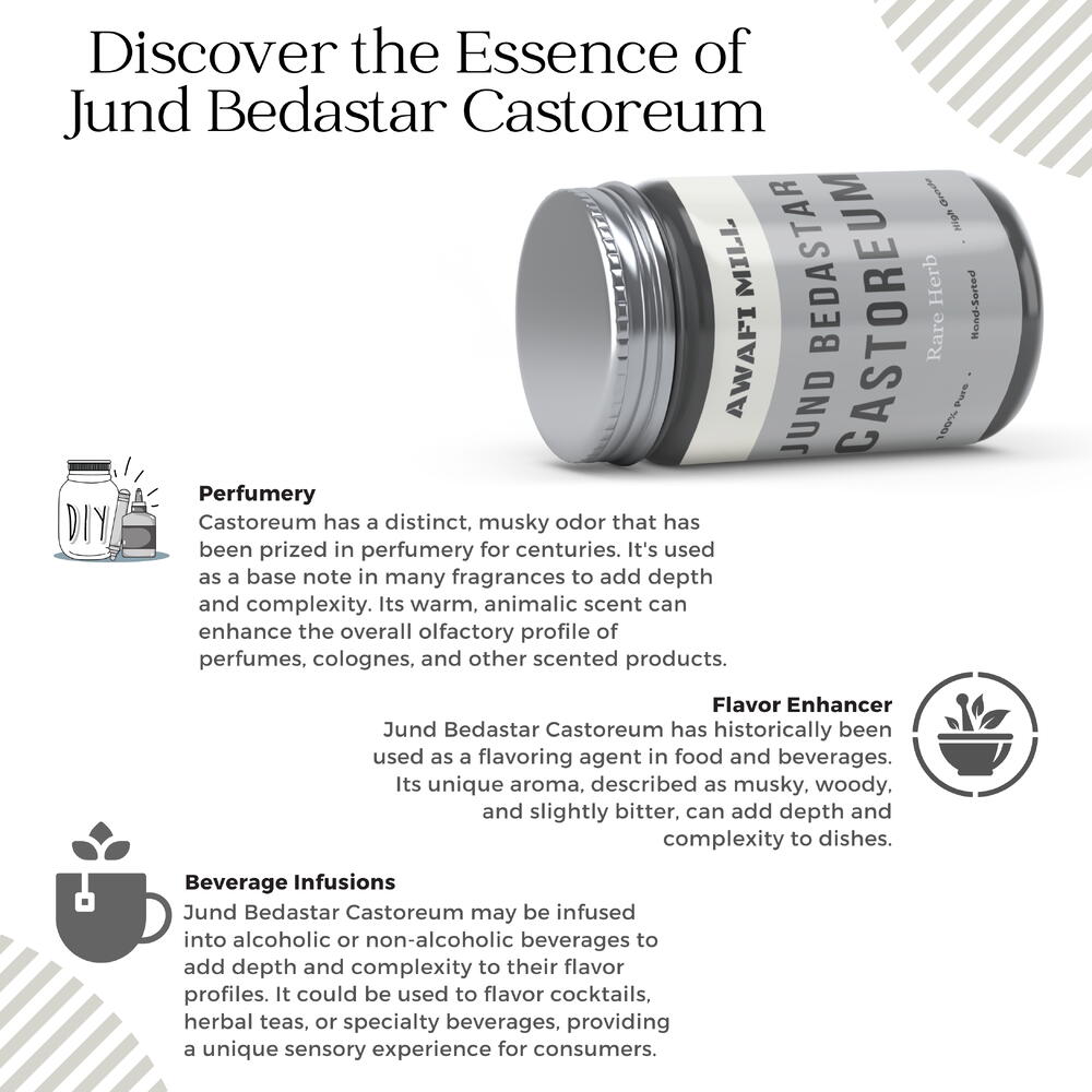 Introducing Jund Bedastar Castoreum, a 100% natural fragrance enhancer meticulously designed to elevate your olfactory experience without compromise. Derived from castoreum, a substance naturally obtained from beavers, this fragrance enhancer emanates a rich and captivating aroma, infusing sophistication into any environment. Crafted with meticulous attention to quality, Jund Bedastar Castoreum serves as a testament to the purity and authenticity of natural fragrances. Its unique and complex scent profile positions it as a versatile choice for enhancing the ambiance of your space. The natural allure of castoreum imparts a warm and inviting character to the fragrance, creating a memorable olfactory experience. Free from synthetic additives, our Castoreum fragrance enhancer invites you to indulge in the pure essence of nature. Embrace the enchanting aroma of Jund Bedastar Castoreum and uncover a natural fragrance enhancer that captivates the senses, offering an unparalleled sensory journey for those who value the beauty of authentic scents. Elevate your space with the warm and alluring fragrance of Jund Bedastar Castoreum, a celebration of nature’s aromatic wonders.