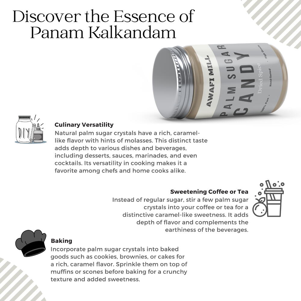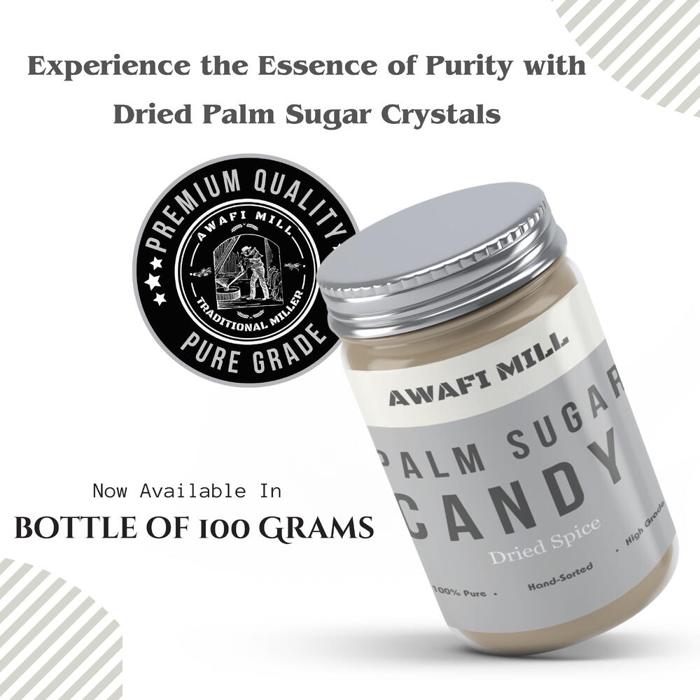 Awafi Mill introduces Natural Palm Sugar Crystals, also known as Panam Kalkandam, offering a unique and organic sweetening solution for your culinary delights. These crystals are derived from 100% pure and organic palm candy sourced from Indian origin. Experience the purity and organic goodness of Natural Palm Sugar Crystals, as Awafi Mill ensures the authenticity and quality of its product directly from Indian palm candy. As a healthier alternative to traditional brown sugar, these crystals provide a delightful sweetening option for various recipes. Unleash the versatility of Palm Sugar Crystals in your culinary creations, desserts, or beverages, imparting a distinct flavor and natural sweetness. Elevate your recipes with the organic sweetness of Palm Sugar Crystals, enhancing the taste of your favorite dishes. Awafi Mill’s Palm Sugar Crystals retain their unrefined goodness, providing a natural and authentic sweetening experience. Packaged with care, these crystals make for a thoughtful and delightful addition to your pantry, allowing you to embrace the goodness of organic and pure sweetness in your everyday culinary adventures.