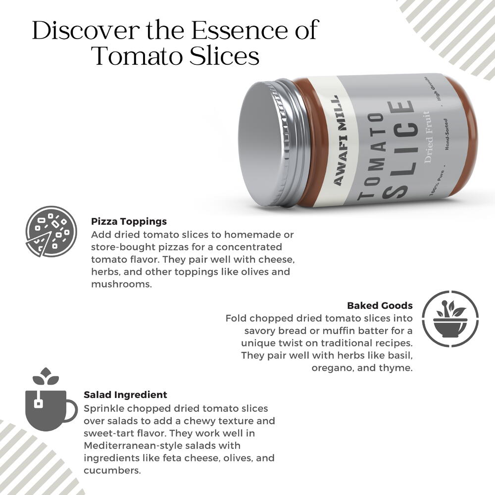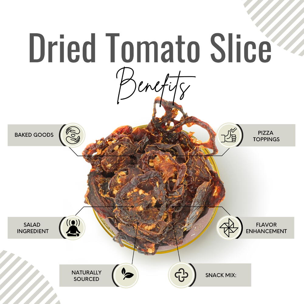 Discover the culinary convenience and rich flavor of our Dried Sliced Tomatoes—versatile dehydrated tomatoes crafted for cooking excellence. Through a meticulous dehydration process, these tomatoes are preserved in convenient slices, ensuring an easy and delightful addition to your favorite dishes. Retaining the natural essence of tomatoes, our Dried Sliced Tomatoes offer a burst of flavor that adds depth to a variety of culinary creations. From soups and salads to pasta dishes and more, these slices are designed to intensify the tomato goodness in your recipes. With a long shelf life and no need for refrigeration, these dehydrated tomato slices become a practical pantry staple, ready to elevate your cooking at a moment’s notice. Whether you’re a home cook or a professional chef, our Dried Sliced Tomatoes bring both versatility and rich taste to your culinary repertoire, making them an essential addition to your kitchen.