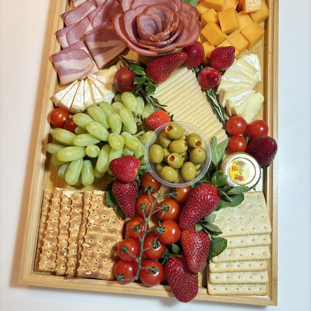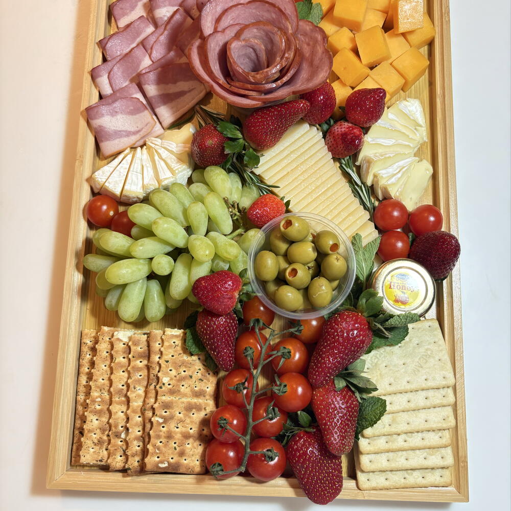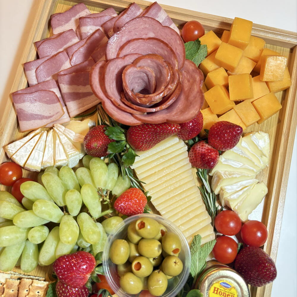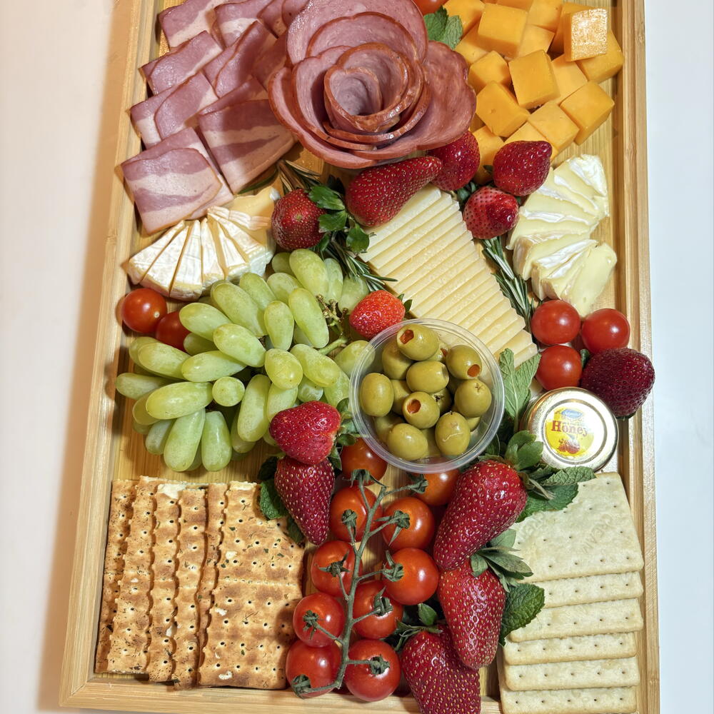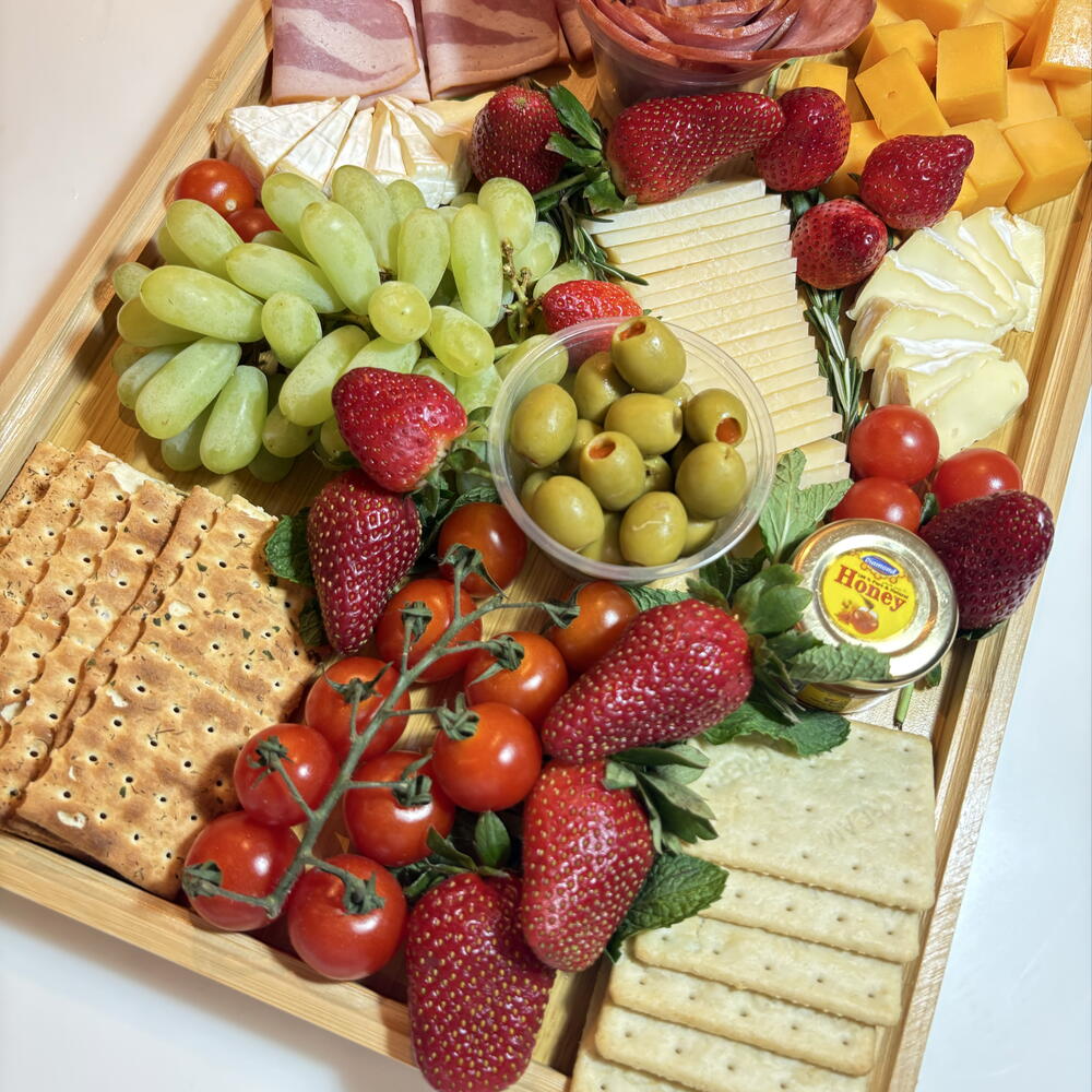 brie cheese - 1 pcs cherry tomatoes - 150 g fresh strawberries - 250 g green grapes - 300 g green olives - 100 g cheddar cheese cubes - 200 g sliced cheese - 200 g smoked beef slices - 200 g honey dip - 1 g fresh mint & rosemary garnish - 10 g premium salami rose - 200 g crackers assortment - 200 g