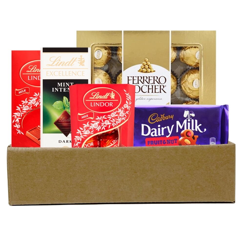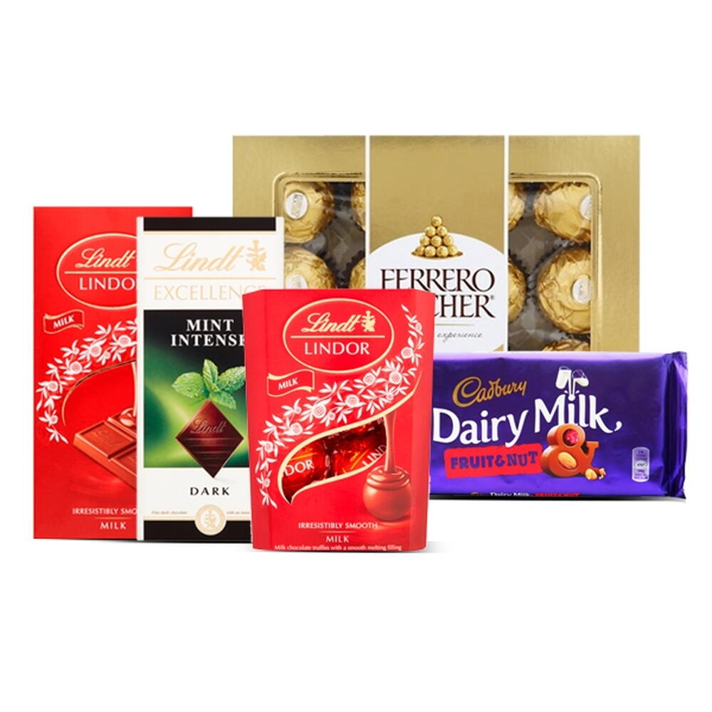 lindt lindor milk bar - 100 g lindt excellence dark mint intense bar - 100 g lindt lindor milk chocolate truffles - 37 g ferrero rocher 12pcs - 1 pcs cadbury dairy milk fruit nut chocolate bar - 110 g