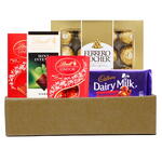 Deluxe Chocolate Gift Hamper – A Sweet Symphony of Premium Flavors Indulge in a luxurious assortment of world-renowned chocolates with this beautifully arranged gift hamper. Perfect for any occasion, this collection features: 🍫 Lindt Lindor Milk Chocolate Bars – Irresistibly smooth and creamy milk chocolate that melts in your mouth. 🍫 Lindt Excellence Mint Intense Dark Chocolate – A rich and refreshing dark chocolate experience with a minty twist. 🍫 Ferrero Rocher – Iconic golden-wrapped hazelnut chocolates, offering a crunchy and creamy delight in every bite. 🍫 Cadbury Dairy Milk Fruit Nut – A classic combination of juicy raisins and crunchy almonds in rich, creamy milk chocolate. 🎁 Perfect for birthdays, anniversaries, thank-you gifts, corporate gifting, or simply treating yourself or a loved one. Packaged in an elegant kraft gift box, this hamper is sure to leave a lasting impression!
