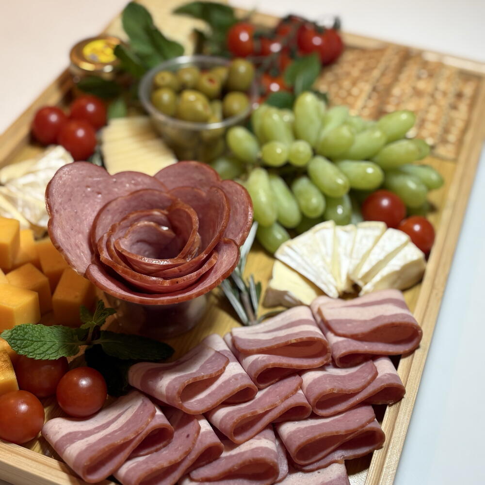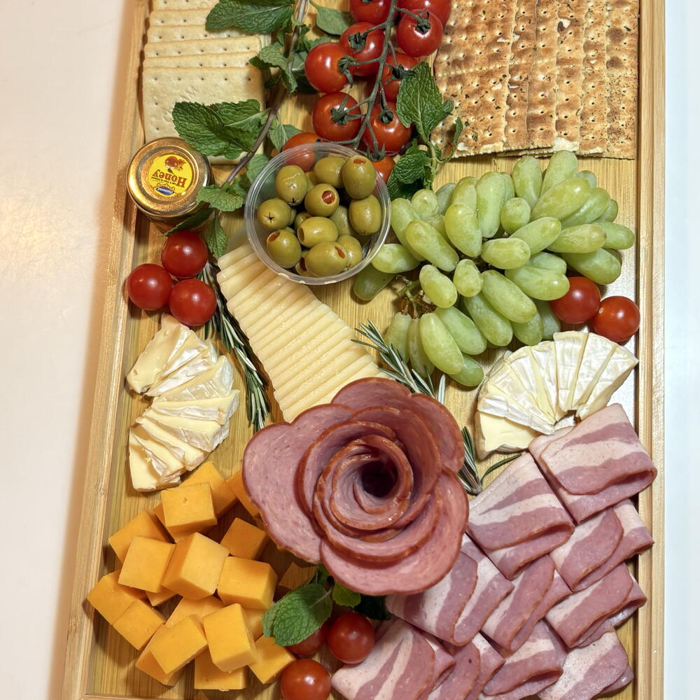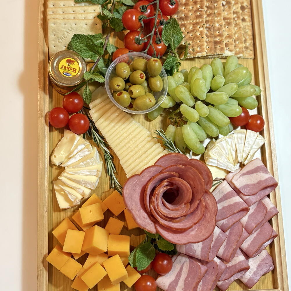 brie cheese - 1 pcs cherry tomatoes - 250 g crackers - 60 g green olives - 20 g cheddar cheese cubes - 200 g sliced cheese - 200 g premium salami - 200 g smoked beef slices - 200 g fresh green grapes - 500 g honey dip - 20 g fresh mint & rosemary garnish - 10 g