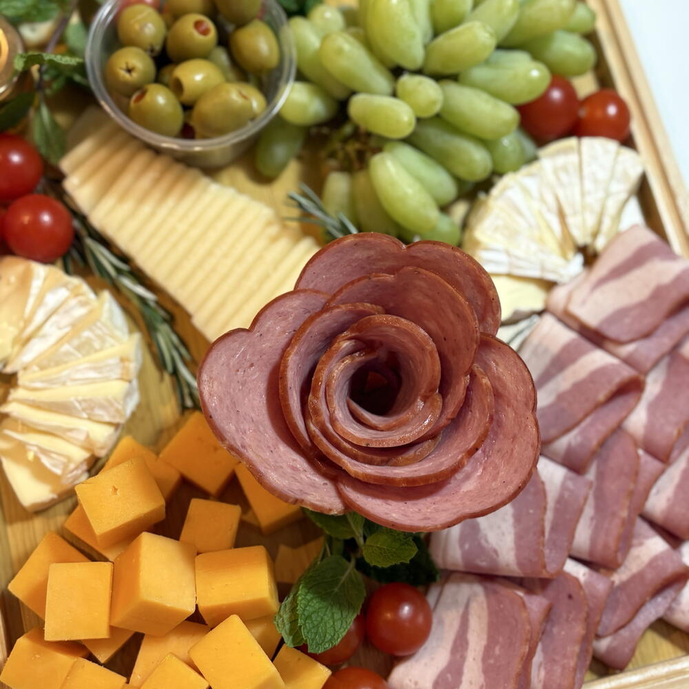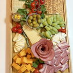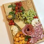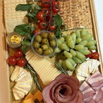 A beautifully arranged gourmet platter perfect for celebrations, gifts, or elegant gatherings. This premium selection includes a variety of fresh cheeses, quality cold cuts, and seasonal fruits, carefully presented on a stylish wooden tray.