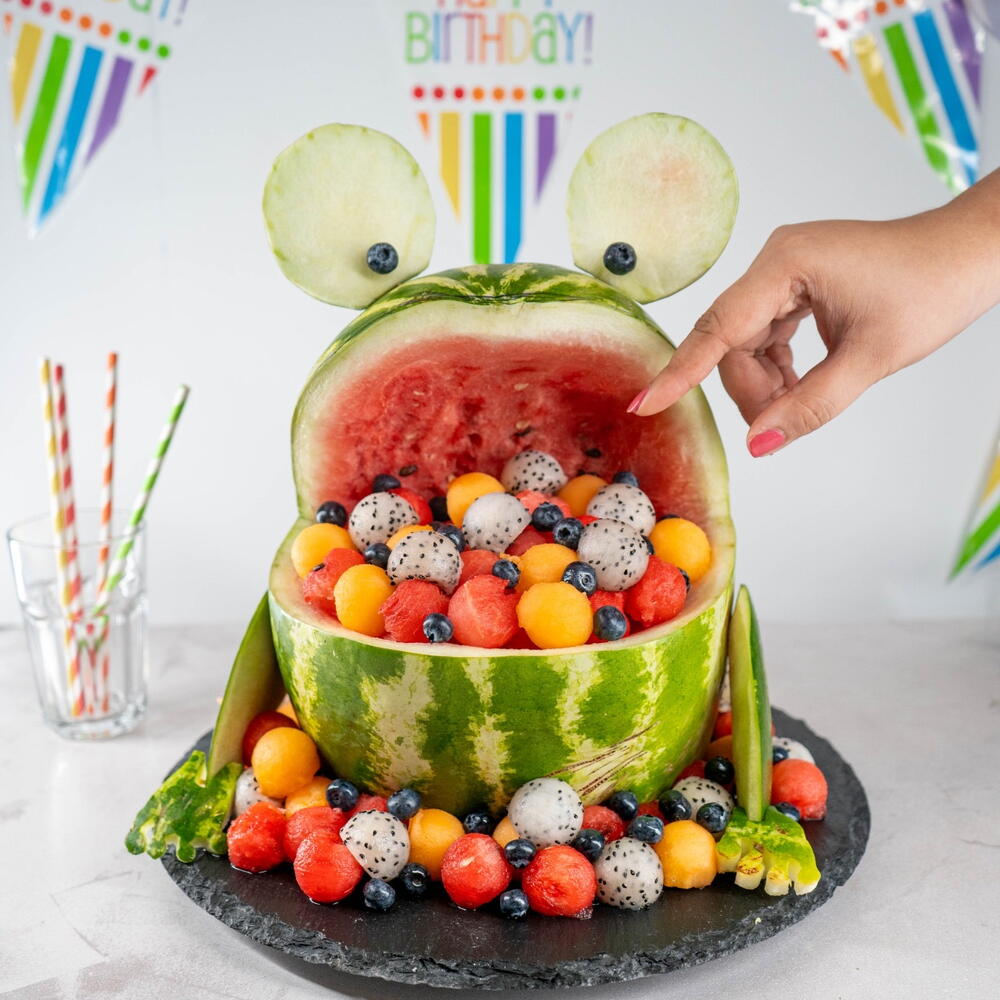 Good for 10 to 12 pax *SUGAR FREE *GLUTEN FREE *NUT-FREE *CALORIE CONSCIOUS *DAIRY FREE *VEGAN . Struggling to find healthy snacks kids will actually enjoy? . Hungry Froggy Birthday Fruit Balls serve sweet fruit balls in a fun frog-shaped watermelon. . • Kids Birthday • Frog Design • Fruit Balls