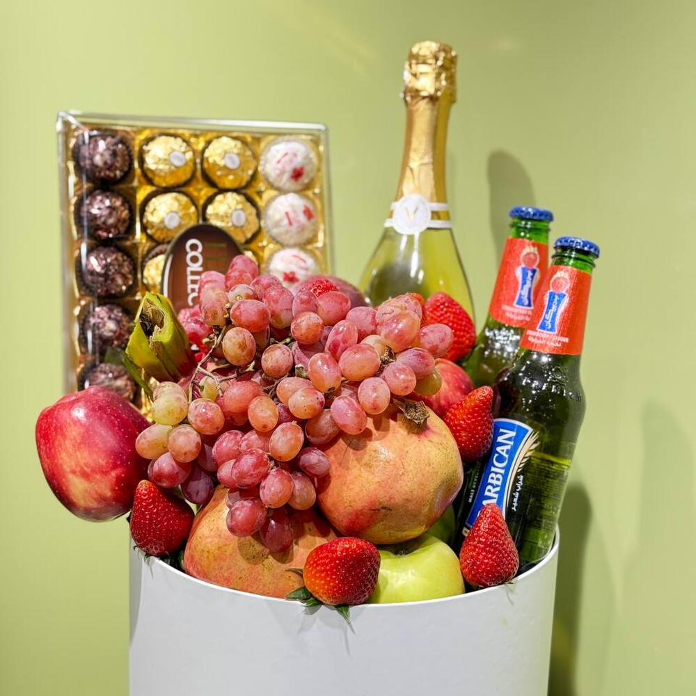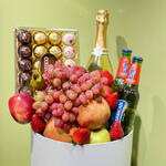 Basket - 1 pcs strawberries - 250 g dragon fruit - 1 pcs green apples - 2 pcs red apples - 2 pcs red grapes - 250 g ferrero rocher collection - 1 pcs vintense fines bulles blanc (non-alcoholic sparkling wine) - 1 pcs barbican pomegranate - 2 pcs fresh pomegranates - 2 pcs