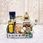 Celebrate the blessings of Ramadan with this sophisticated Ramadan Premium Coffee, Dates Honey Gift Hamper, thoughtfully curated to combine tradition with modern elegance. Beautifully arranged in a decorative star-cut metal tray, this refined assortment features premium dates, crunchy nuts, pure honey, and a luxury coffee selection complemented by a golden Ramadan lantern and elegant floral accents for a graceful festive presentation. Perfect for Iftar gatherings, corporate gifting, or sending heartfelt Ramadan wishes, this hamper brings together rich flavors, warmth, and timeless style in one beautifully designed arrangement.
