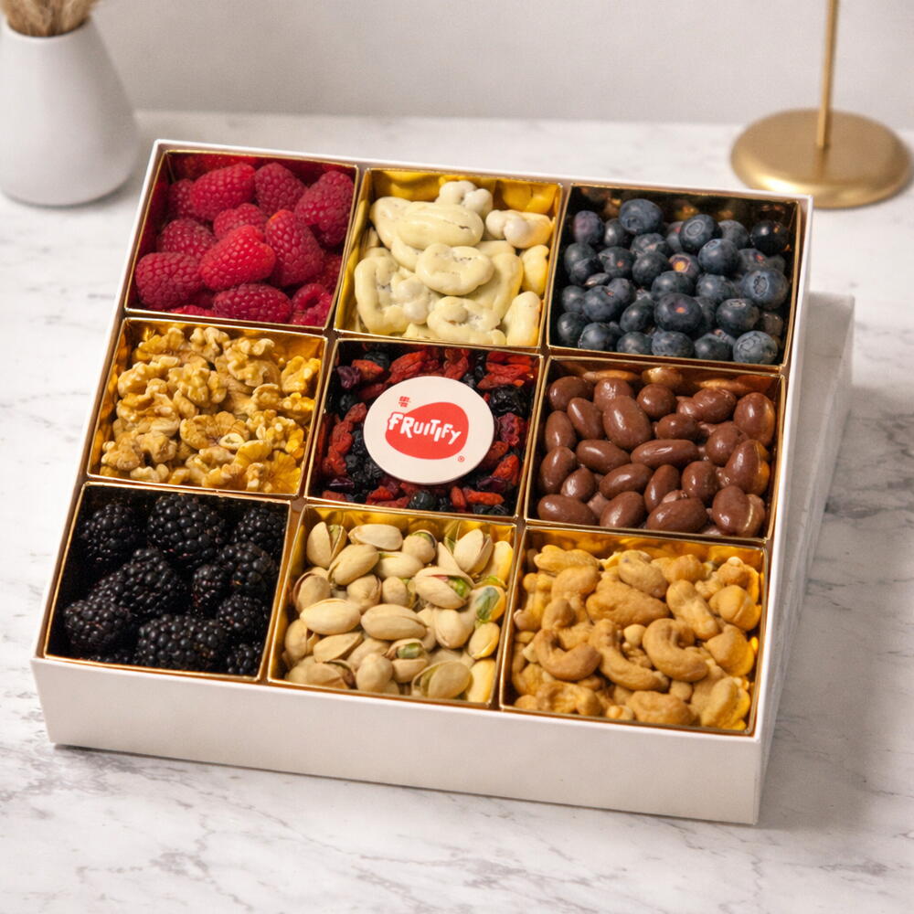 A premium 9-grid gift box featuring a perfect balance of fresh berries, crunchy nuts, and sweet treats. Beautifully arranged and ready to gift for any occasion.