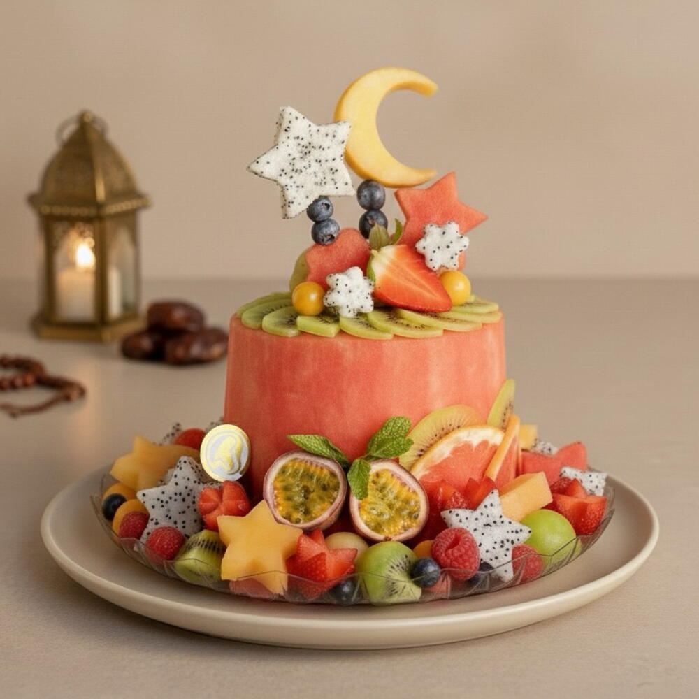 Good for 9 to 11 pax. *SUGAR FREE *GLUTEN FREE *NUT-FREE *CALORIE CONSCIOUS *DAIRY FREE *VEGAN . Looking for a light and refreshing dessert for Iftar instead of heavy sweets? . Noor Melon Cake offers a beautifully carved watermelon cake topped with fresh fruits, perfect for a healthy Ramadan celebration. . • Ramadan Dessert • Fresh Fruit Cake • Healthy Iftar