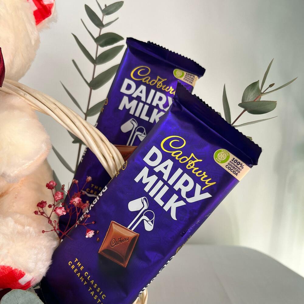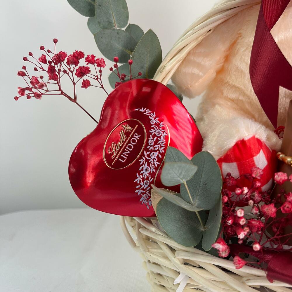Basket - 1 pcs teddy - 1 pcs eucalyptus leaves - 2 pcs gypsum stick - 1 pcs dairy milk cadbury bar - 2 pcs lindt heart box - 1 pcs